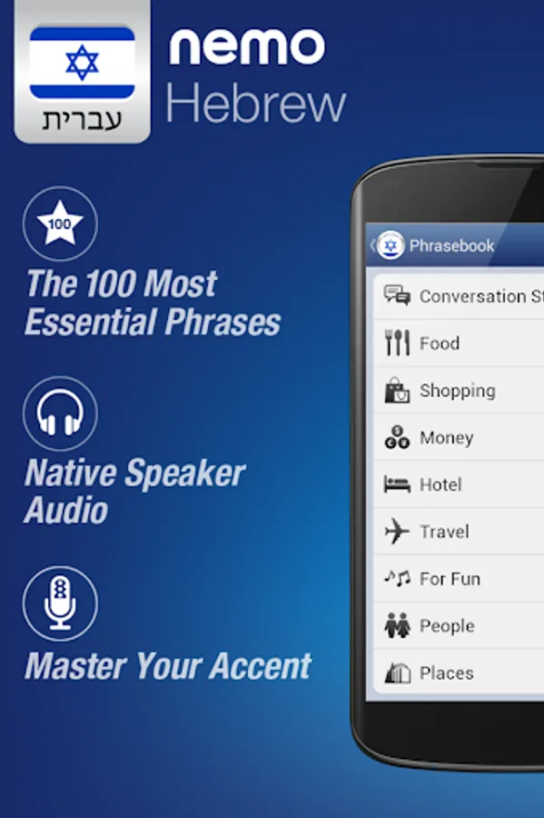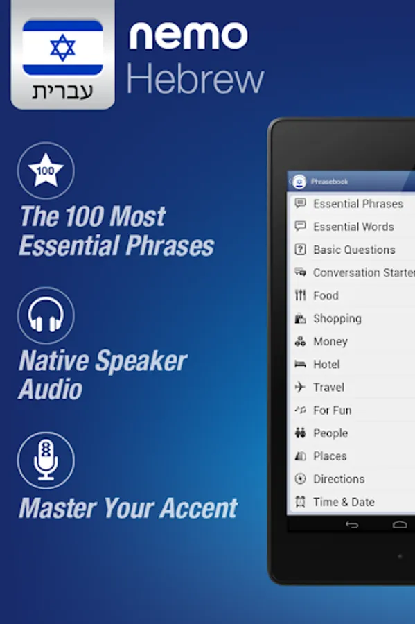 Nemo is designed to start you speaking the most useful words in Hebrew immediately and confidently. With millions of downloads from around the world, Nemo is now available for Android phones and tablets.