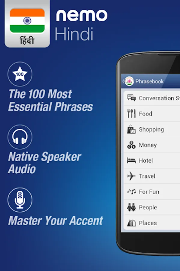 Nemo is designed to start you speaking the most useful words in Hindi immediately and confidently. With millions of downloads from around the world, Nemo is now available for Android phones and tablets.