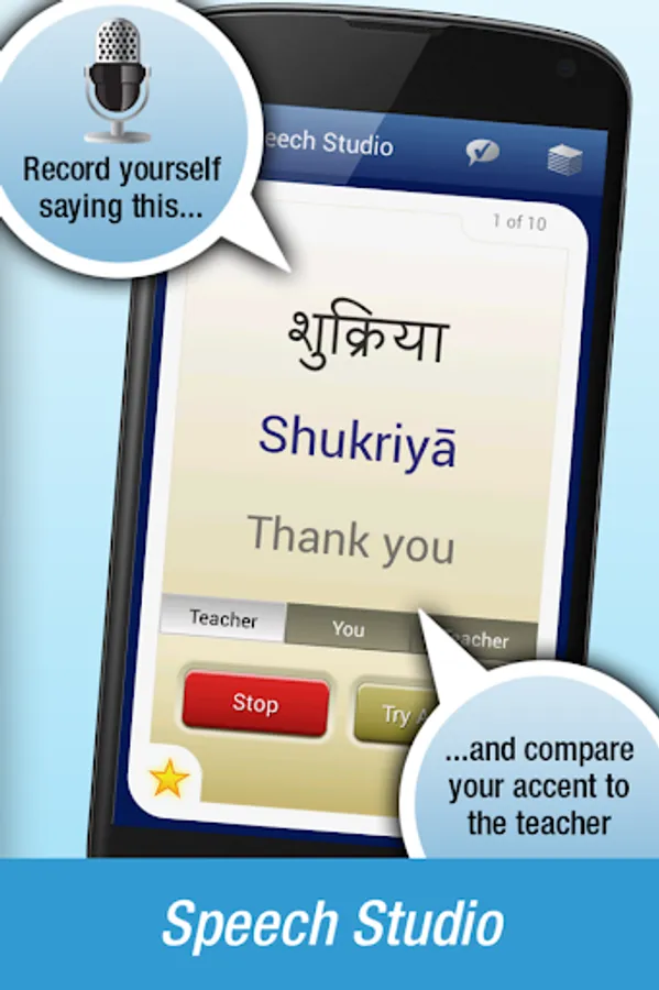 Nemo targets the words and phrases most often used in conversation. For beginners, we’ve prepared “If You Only Learn 10 Things”, “If You Only Learn 50 Things”, and “If You Only Learn 100 Things” lists for a fast introduction to the essentials. Intermediate learners can progress to a course of the highest frequency words needed for travel and business and begin to have conversations in Hindi in a month. Advanced students will benefit most from the Speech Studio technology to correct their foreign accent.