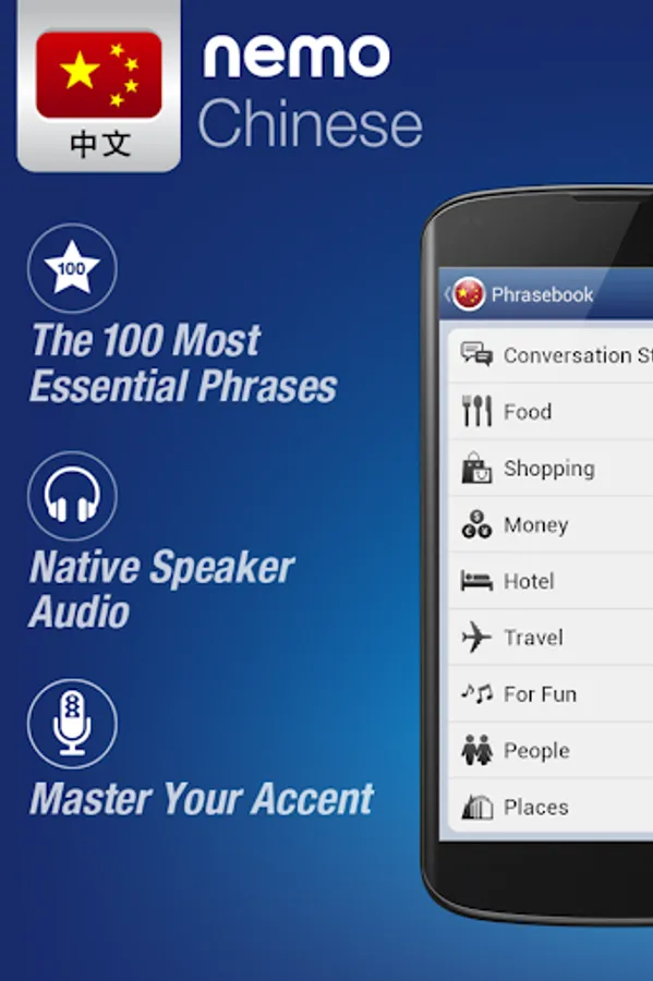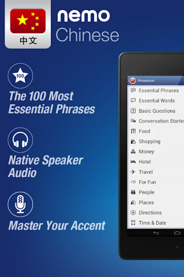Nemo is designed to start you speaking the most useful words in Chinese immediately and confidently. With millions of downloads from around the world, Nemo is now available for Android phones and tablets.