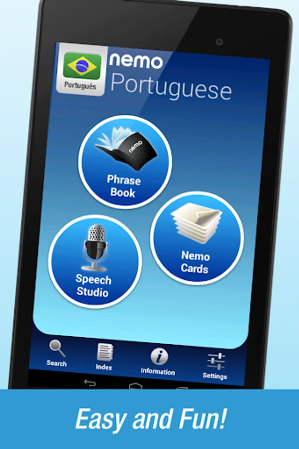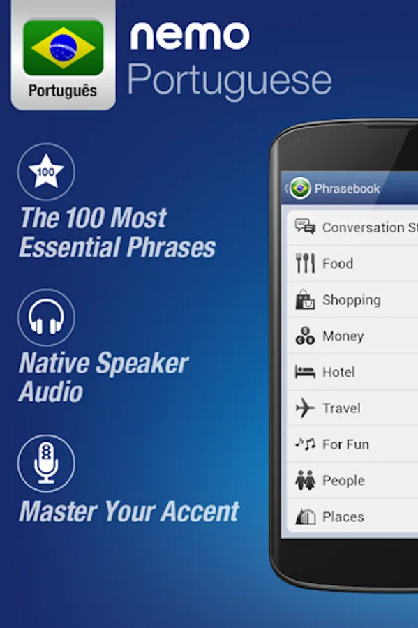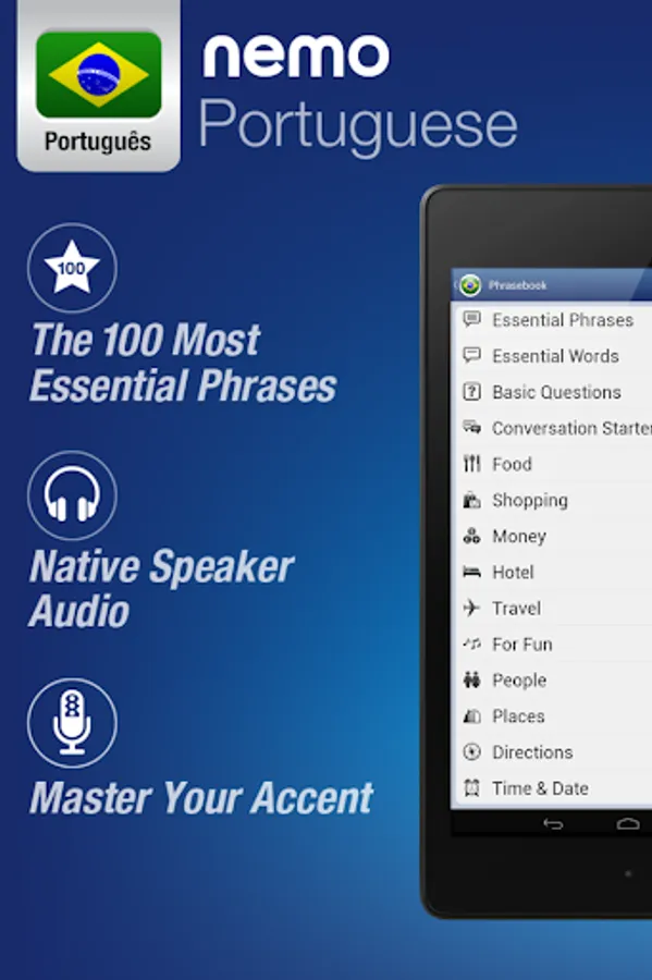 Nemo is designed to start you speaking the most useful words in Portuguese immediately and confidently. With millions of downloads from around the world, Nemo is now available for Android phones and tablets.