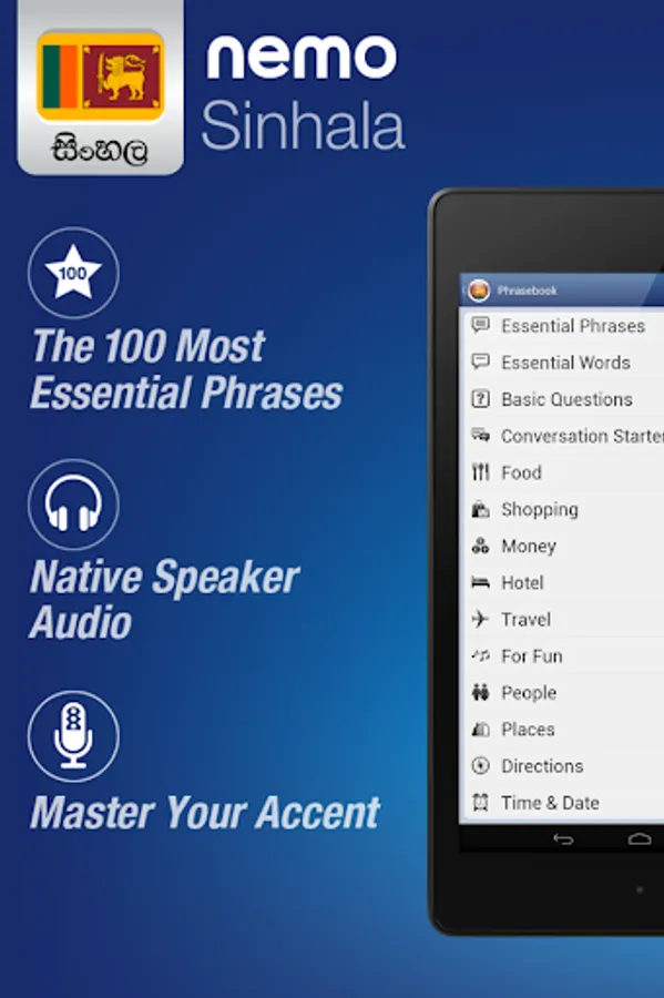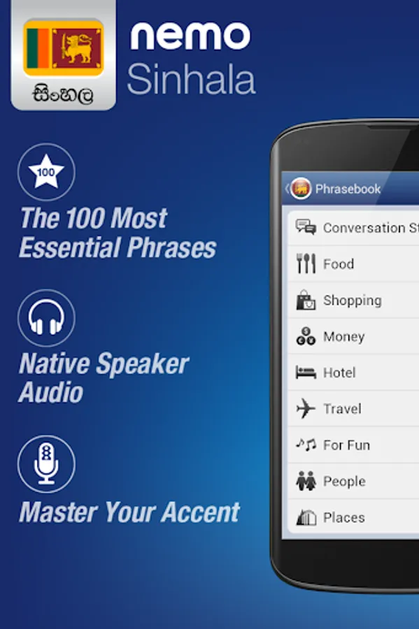 Nemo is designed to start you speaking the most useful words in Sinhala immediately and confidently. With millions of downloads from around the world, Nemo is now available for Android phones and tablets.