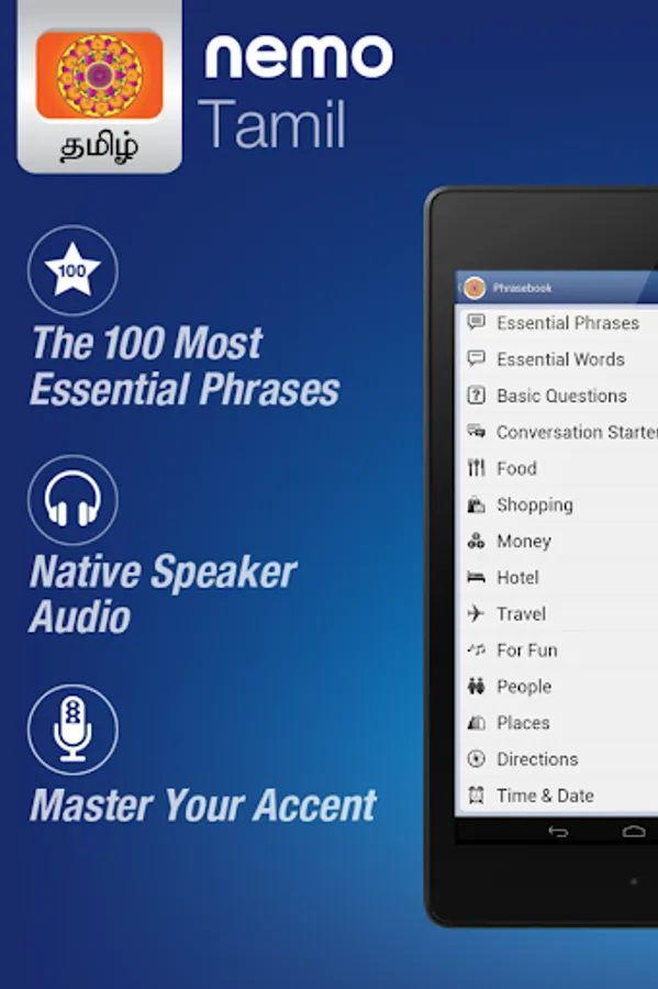 Nemo is designed to start you speaking the most useful words in Tamil immediately and confidently. With millions of downloads from around the world, Nemo is now available for Android phones and tablets.