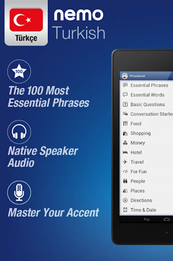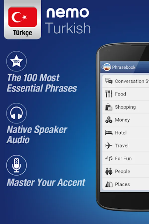 Nemo is designed to start you speaking the most useful words in Turkish immediately and confidently. With millions of downloads from around the world, Nemo is now available for Android phones and tablets.