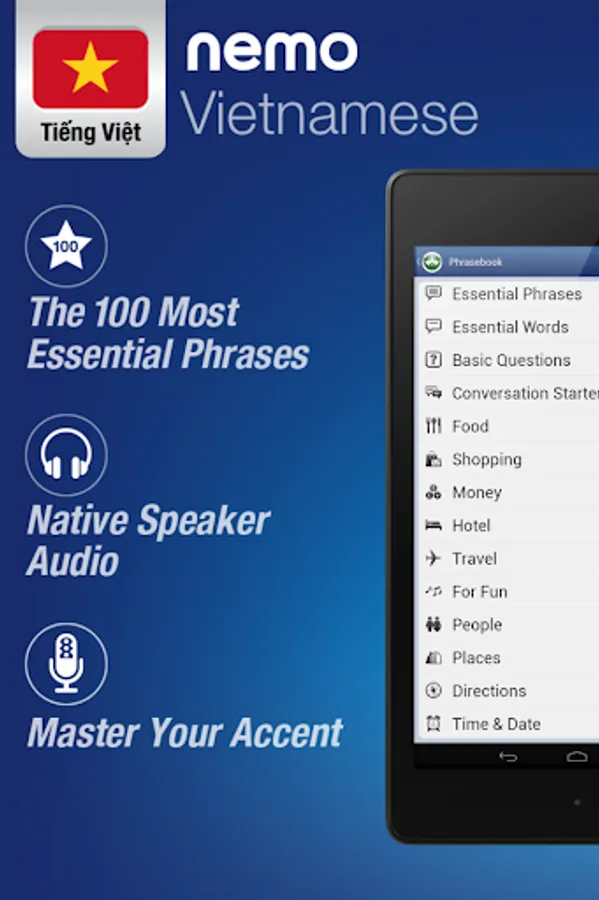 Nemo is designed to start you speaking the most useful words in Vietnamese immediately and confidently. With millions of downloads from around the world, Nemo is now available for Android phones and tablets.