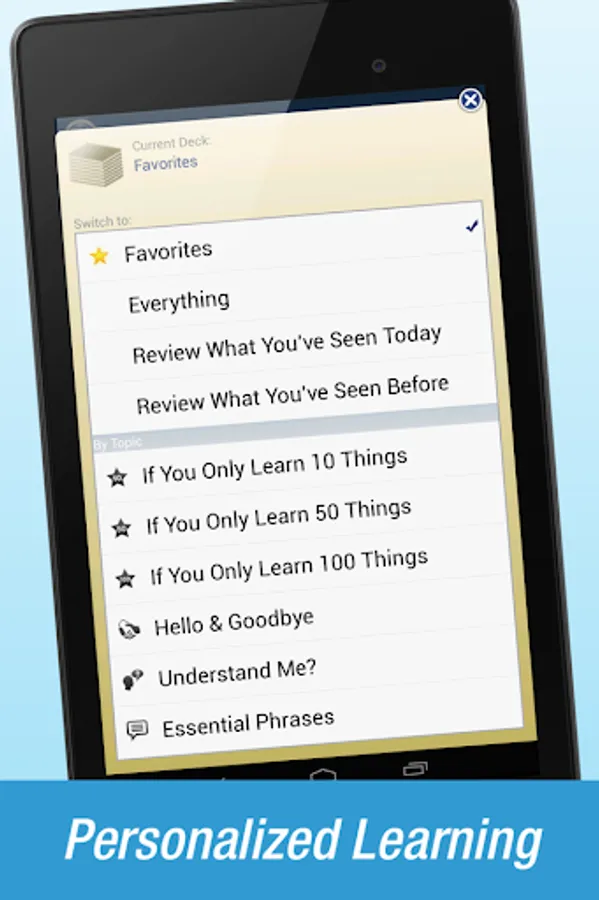 Any card can be marked as a favorite, allowing you to make your own custom deck of cards to focus on the words of the day. Turn on Review Mode to recap what you practiced earlier in the day to boost your memory retention.