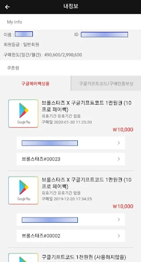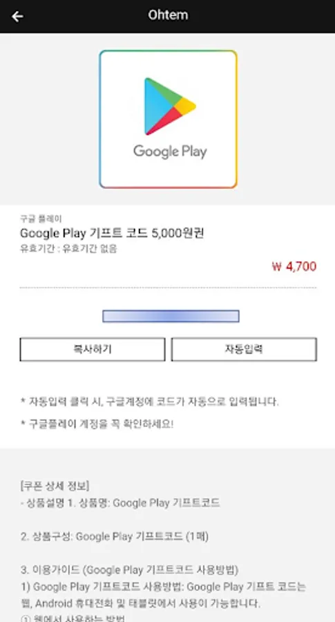 4. 쿠폰함에서 핀번호 복사하기 / 내 구글계정에 즉시충전하기 기능
