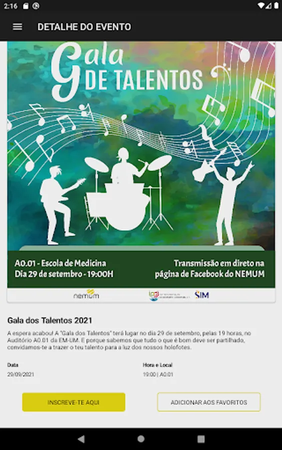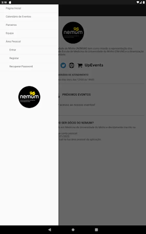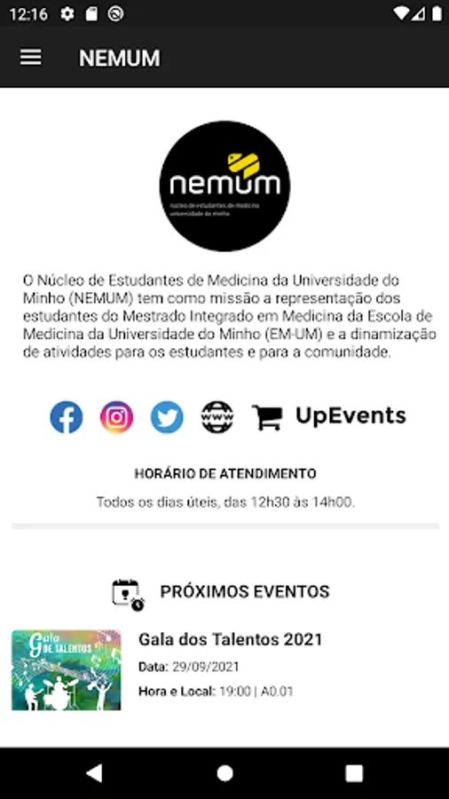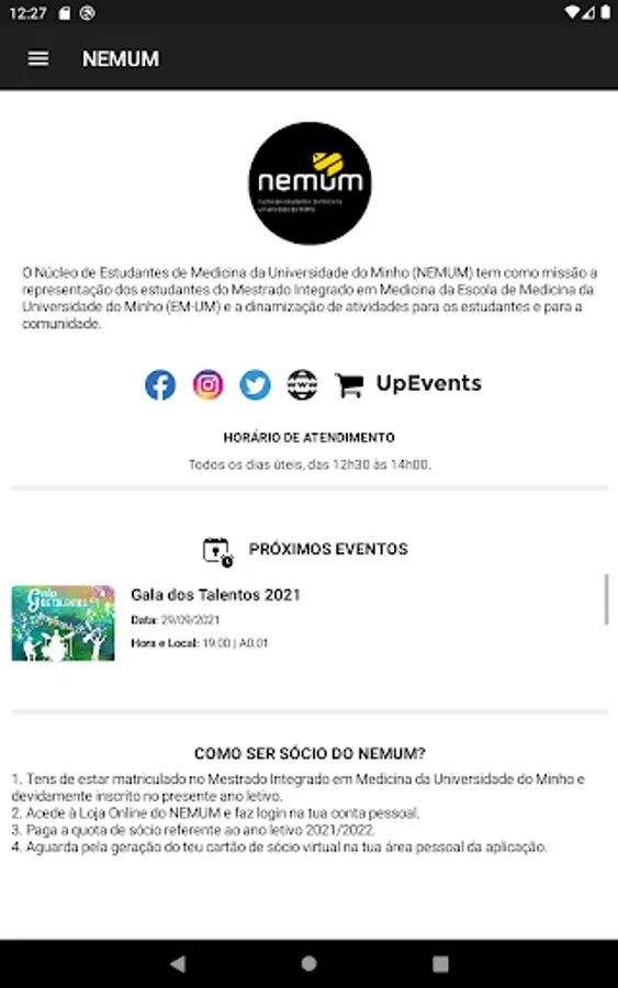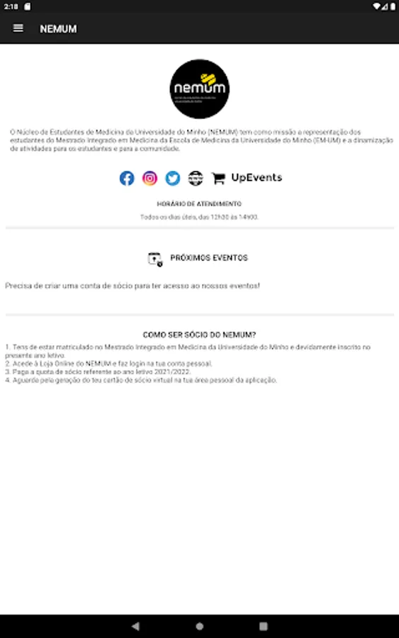 Get closer to your Nucleus, the Medical Students Nucleus of the University of Minho! Check our activities calendar, access your membership card and don't miss out on the partnerships we have for you! Install the app now to enjoy this and much more!