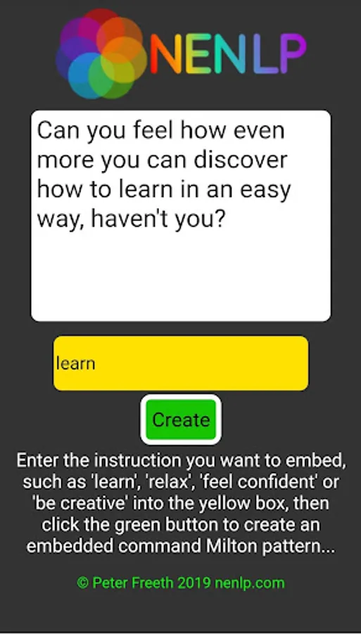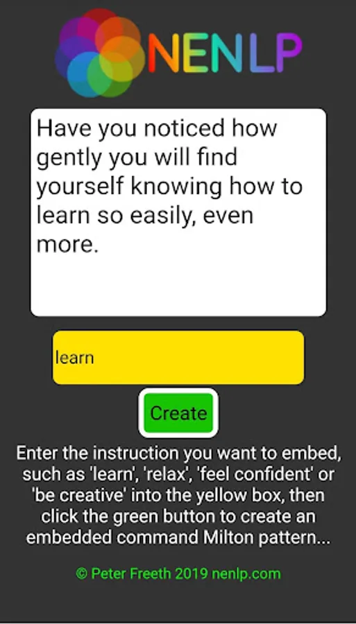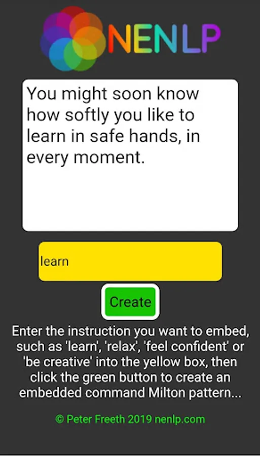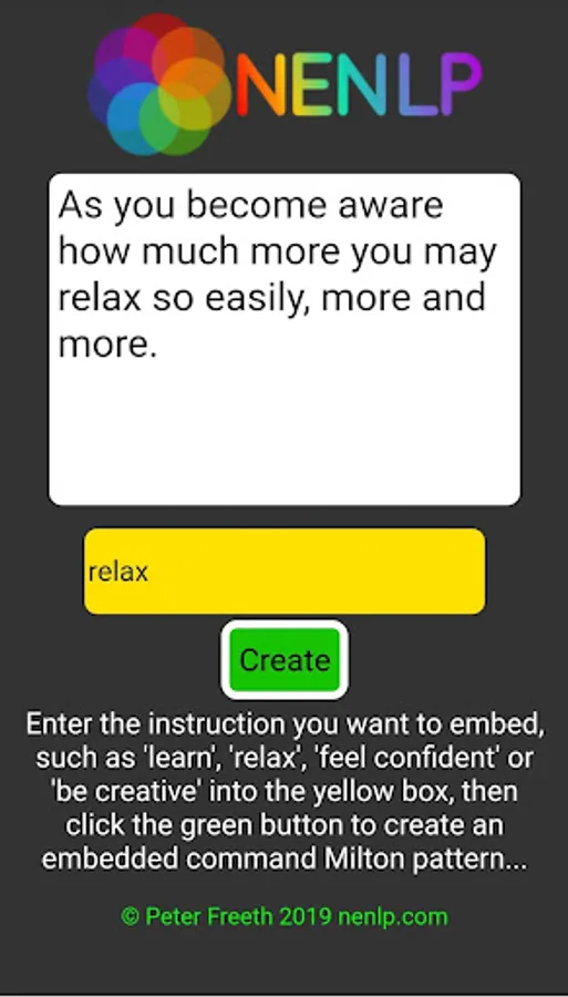 The app works by taking a command that you enter, such as 'learn', 'relax', 'feel confident' or 'be creative' and using it to create an embedded command Milton pattern from a library of awareness predicates, commentary adjectives, selectional restriction violations, tag questions and more.