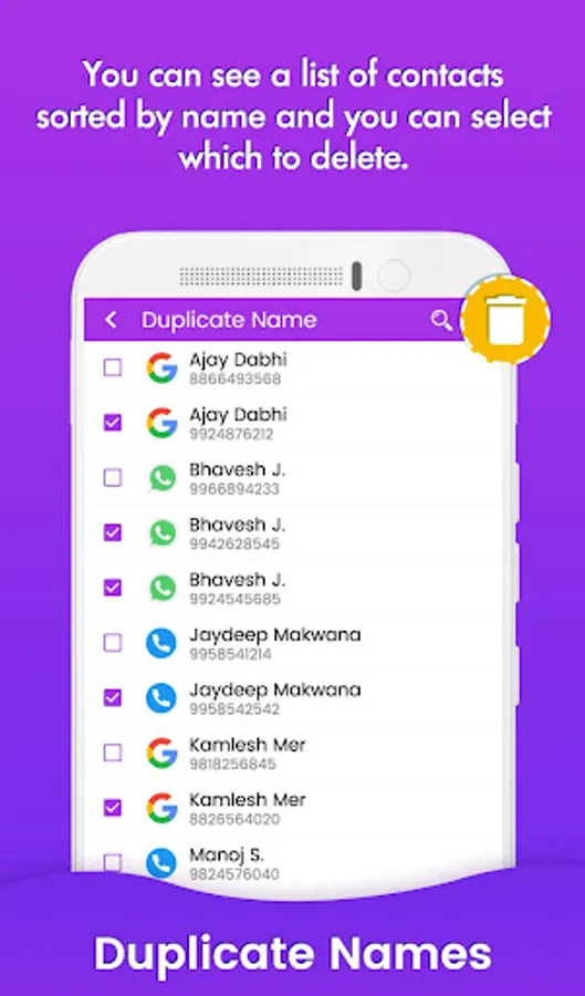 You can see a list of contacts sorted by name or by number and you can select which to delete. The duplicate contacts are automatically selected. The removed contacts are saved on .vcf file on phone memory.