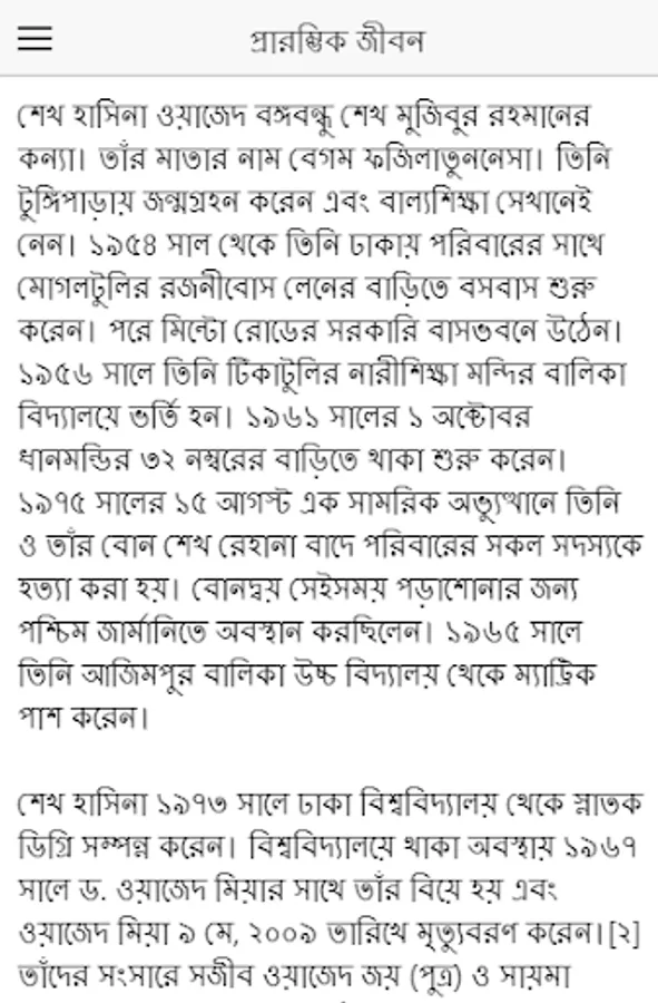 Sheikh Hasina, daughter of Bangabandhu Sheikh Mujibur Rahman. His mother's name Fazilatunnesa Begum. Tungipara was born and where he took balyasiksa. Since 1954, the shipping lane in the house began to rajanibosa mogalatulira family. Minto Road later became the official residence. In 1956, he was admitted to the girls' school house Tikatuli education. 1961 began on October 1, Dhanmondi house number 3. August 15, 1975 military coup, she and her sister Sheikh Rehana, excluding family members were killed. While bonadbaya was West Germany to study. Azimpur Girls' High School in 1965, he passed the matriculation examination. She completed a bachelor's degree in 1973 from Dhaka University. While at the university in 1967, he said. She was married to Dr Miah and Dr Miah 9 May, died on 009. Joy of their family (sons) and Saima puppet (daughters) are the two children.
