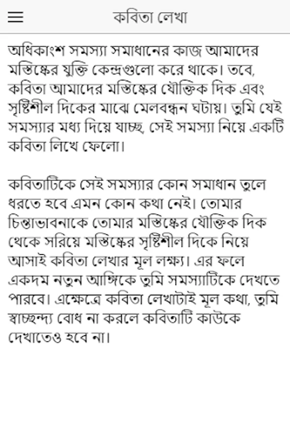 The argument centers of our brain is working to solve the problem. However, the logistical aspects of poetry and creative side of our brain causes the hybrid. The problems you are going through, Write a poem about the problem. The problem will highlight the poem, there is no such thing. The logical side of your brain Your thoughts come from the brain of creative poetry writing at the goal. You will see a new look at the issue. Lekhatai the original poem, the poem that you feel comfortable if you do not need to do anything.