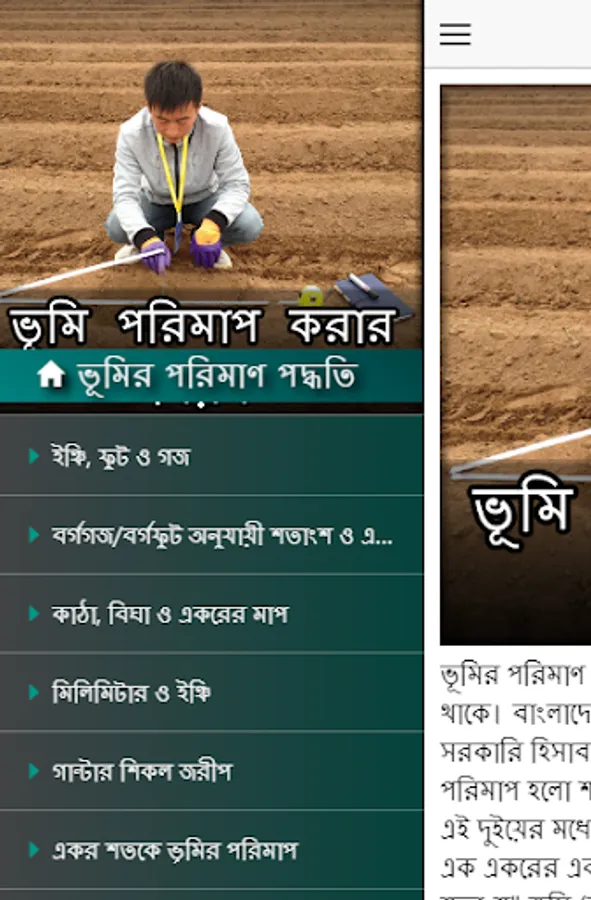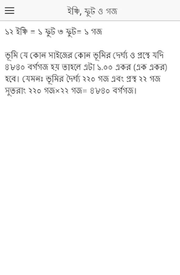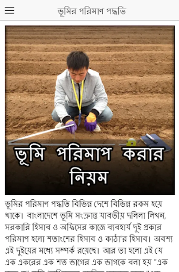 Different types of land are different in different countries. The calculation of percentages and katha accounts of the two types of land related documents in Bangladesh, the use of government accounts and office use. However, there is a relationship between these two. And that is that one-hundredth part of one acre is called "one percent" land (the most commonly used phrase is "a decimal land"). On the other hand, the superior unit of the katha is "Bigha" and the superior unit of Bigha is "acre." One bigha land equal to 20 kathas and one bigha land equivalent to three bighas. This measure is universal, and approved as a "Standard Measurement." In Bangladesh, the quantity of land is measured according to the Gantar Chal Zarip method. Sometimes, on an official basis, hectares are used on official papers.