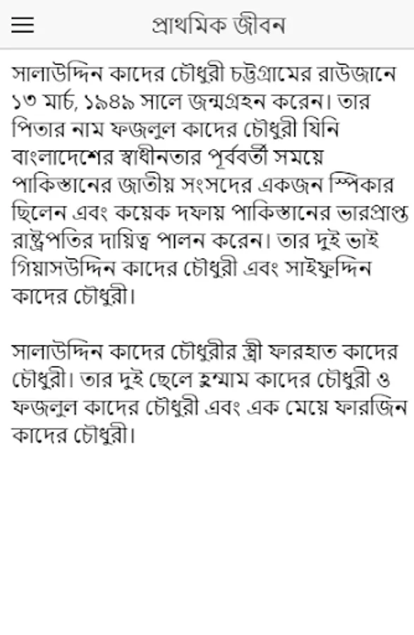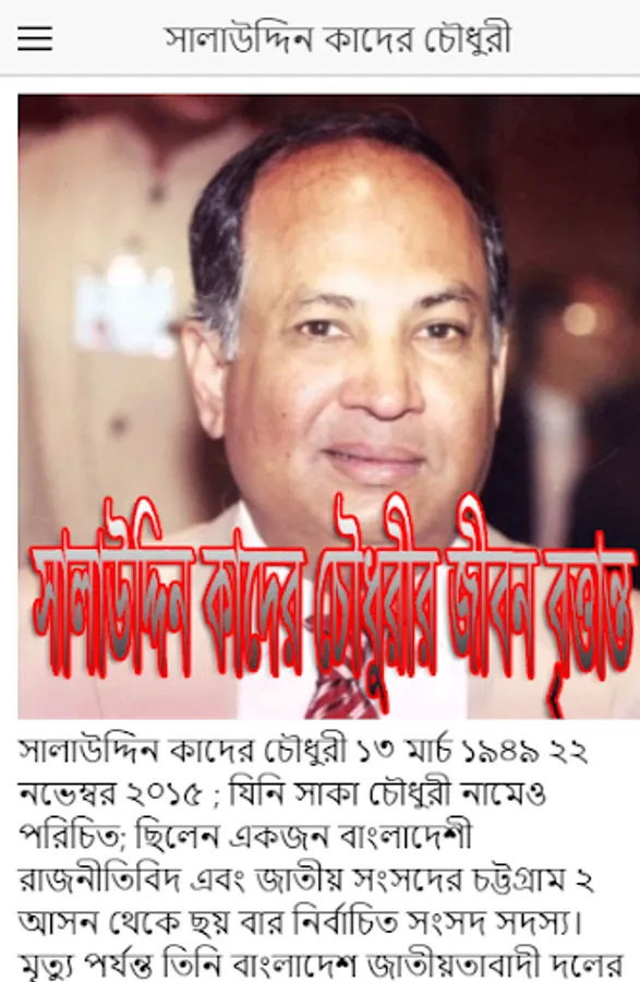 Salauddin Quader Chowdhury 13 March 1949 22 November 2015; Who is also known as Saka Chowdhury; He was a Bangladeshi politician and six times elected Member of Parliament from Chittagong 2 seats of the Jatiya Sangsad. Until his death, he was a member of the Standing Committee of the Bangladesh Nationalist Party. He was hanged on 22 November 2015 for crimes against humanity during the war of liberation. His conviction raised various questions from internal and external sources in Bangladesh regarding the tribunal's trial. He was sentenced to death on October 1, 2013 by the International Criminal Tribunal for the former Yugoslavia (ICTY) for torture, murder and genocide during the war. On November 17, 2015, the High Court rejected his appeal for review of the verdict. According to prison officials, Salauddin appealed to the President of Bangladesh for mercy, but his request was rejected. However, according to his family members, he did not appeal to the President to get relief from the death penalty.
