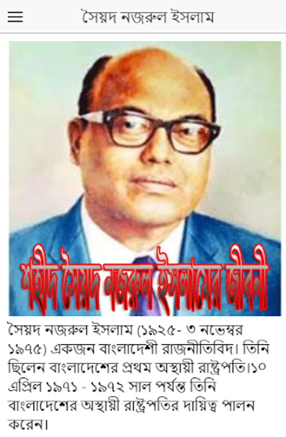 Syed Nazrul Islam (1925 3 November 1975) is a Bangladeshi politician. He was the country's first interim president on April 10, 1971 - 197 until he was Acting President of Bangladesh.