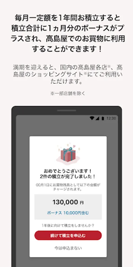 If you accumulate a fixed amount every month for 12 months, you will be able to use it as a "shopping balance" with a bonus for one month as a smartphone payment!