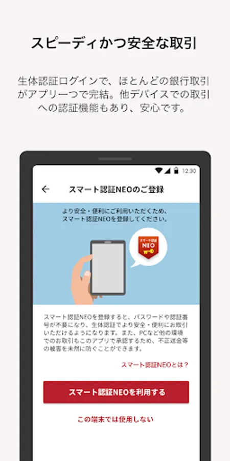 ・By registering for Smart Authentication NEO, you do not need a web transaction password or authentication number for each transaction. Unauthorized remittances can be prevented and speedy and safe transactions are possible.