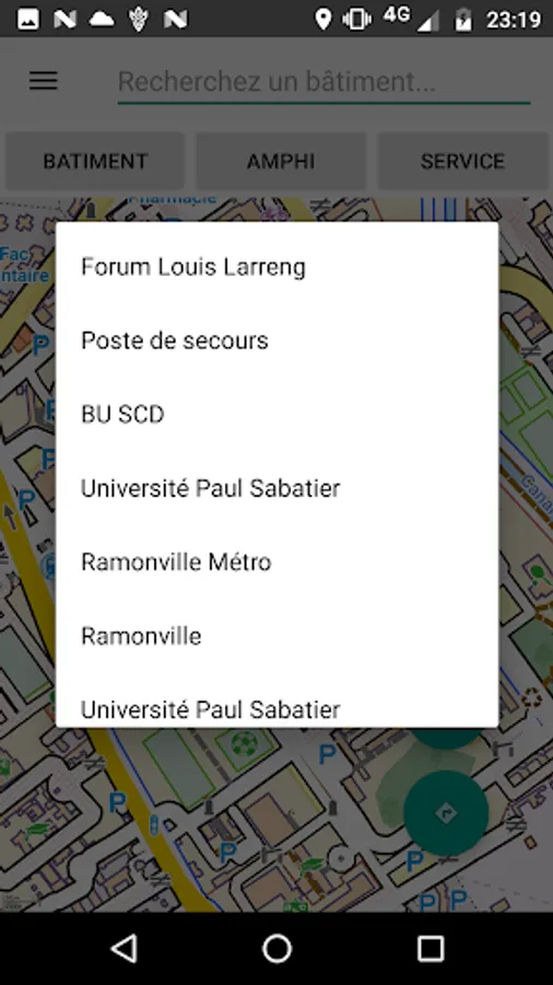 This application allows to move easily on the campus of Paul Sabatier, to easily find these buildings and services.
