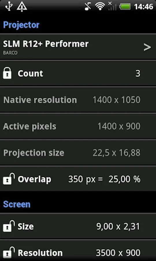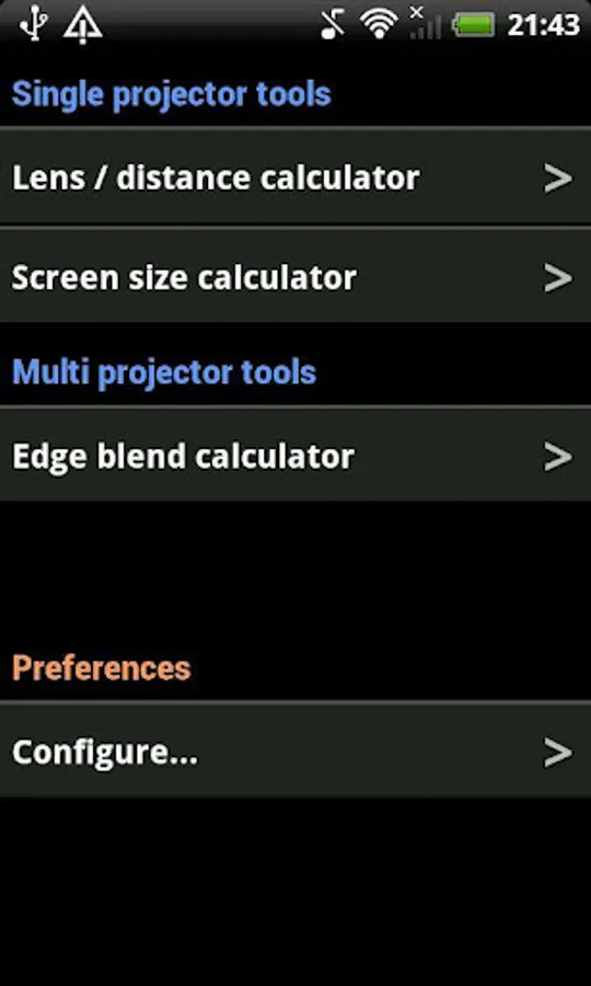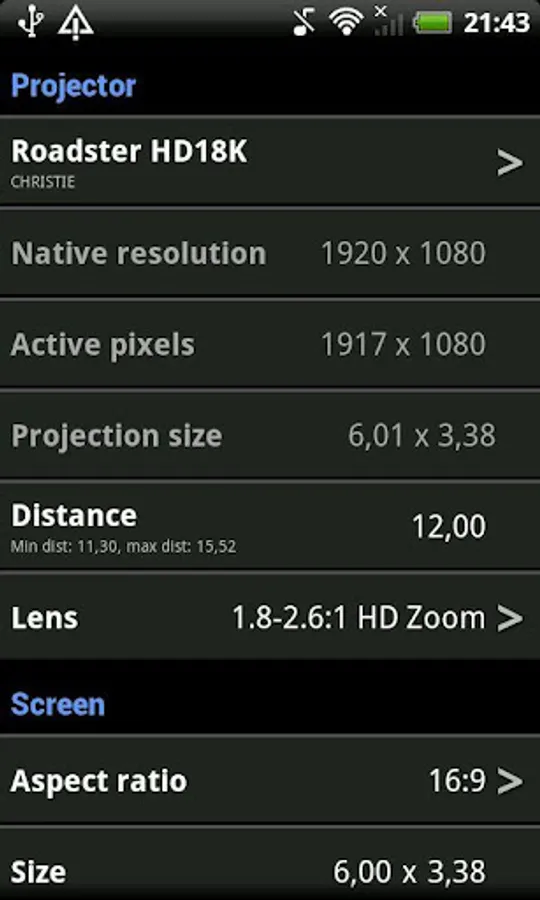 The app can be used to calculate projector lens & distance at a given screen size, or calculate screen size from a given distance & lens for a particular projector. In addition many edge blend calculations can be made.