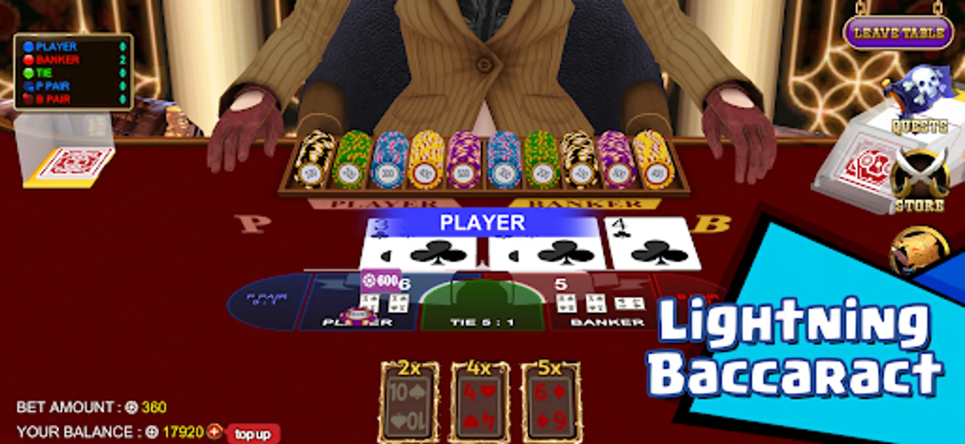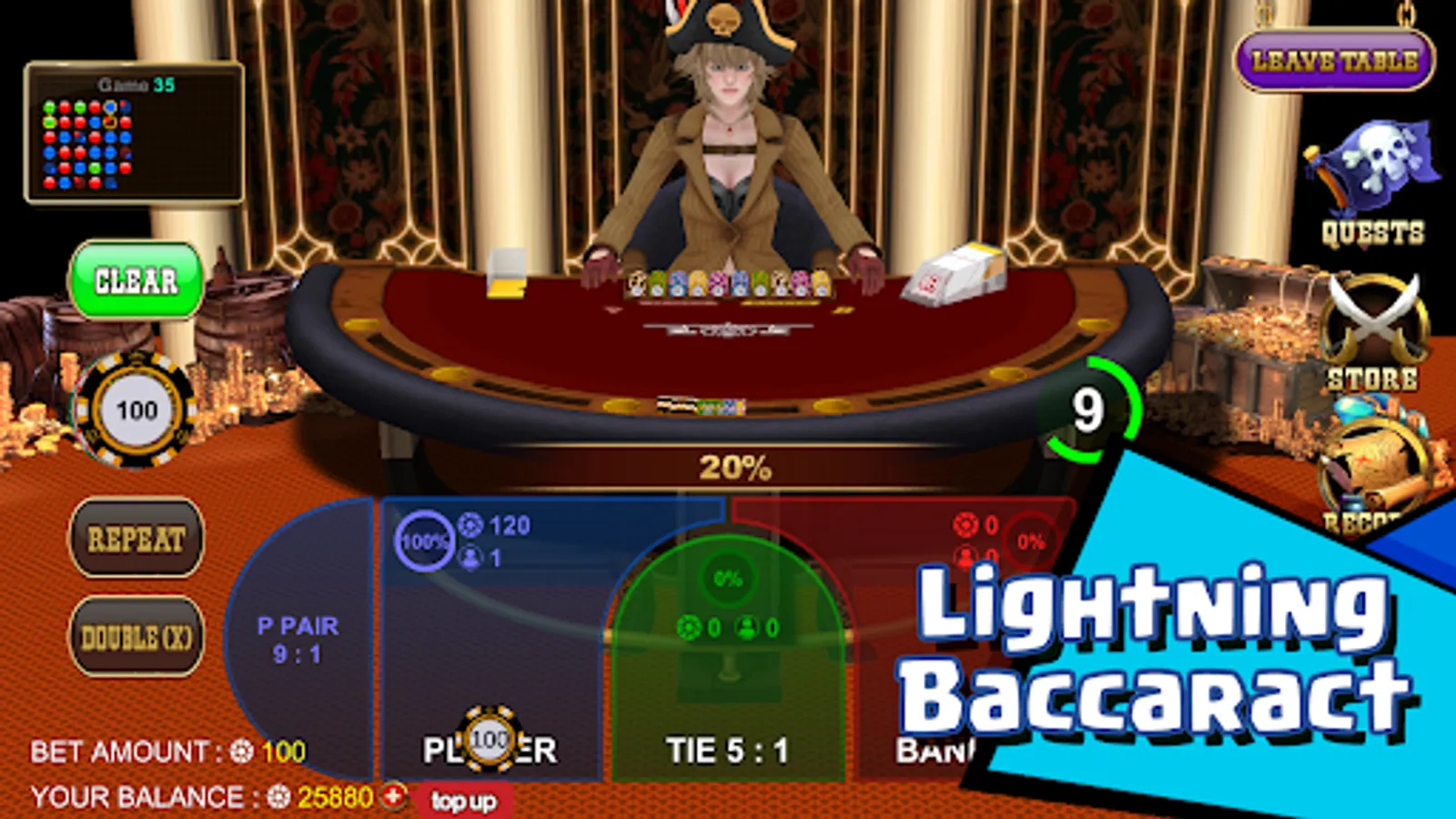 《Lightning Baccarat》 is a casual baccarat game created in corsair style. Players can choose between the traditional baccarat known to the players and the lightning gameplay featured in this game. Feel a different gaming experience from traditional baccarat.