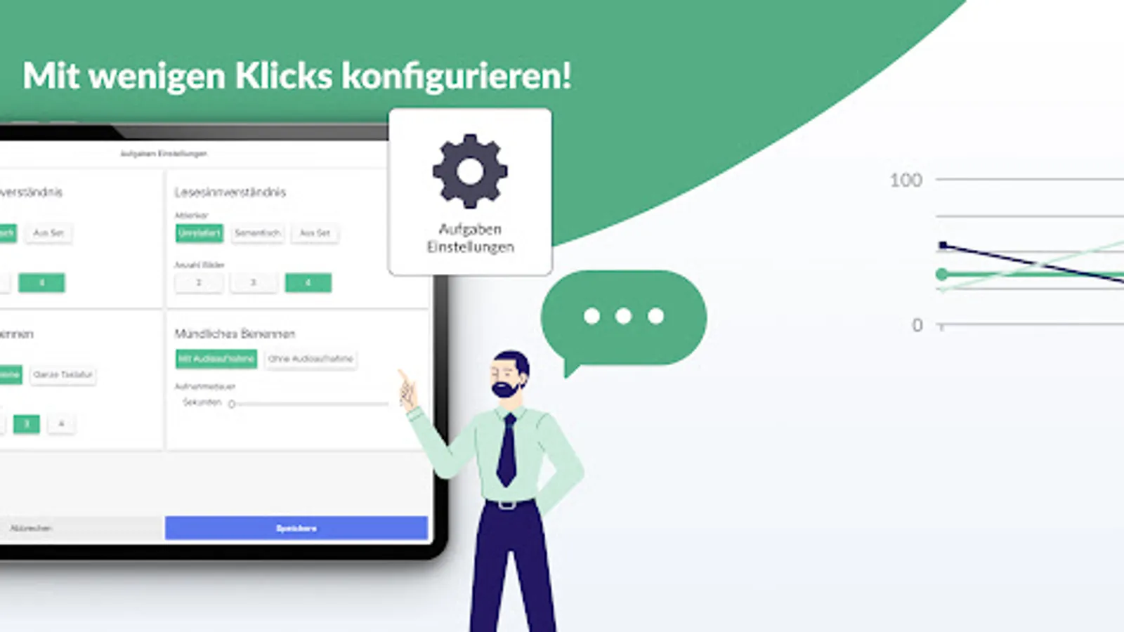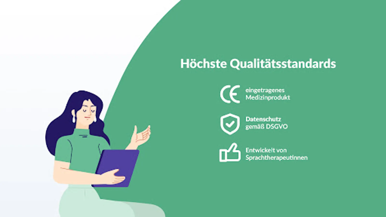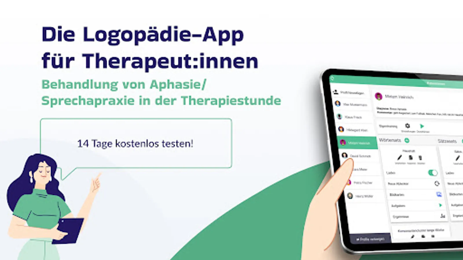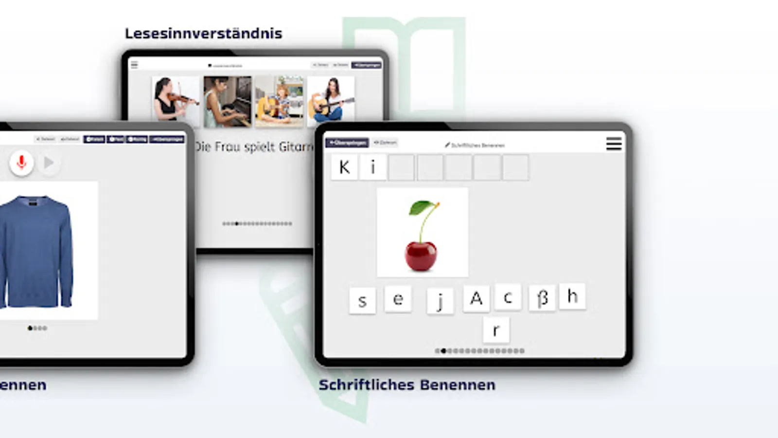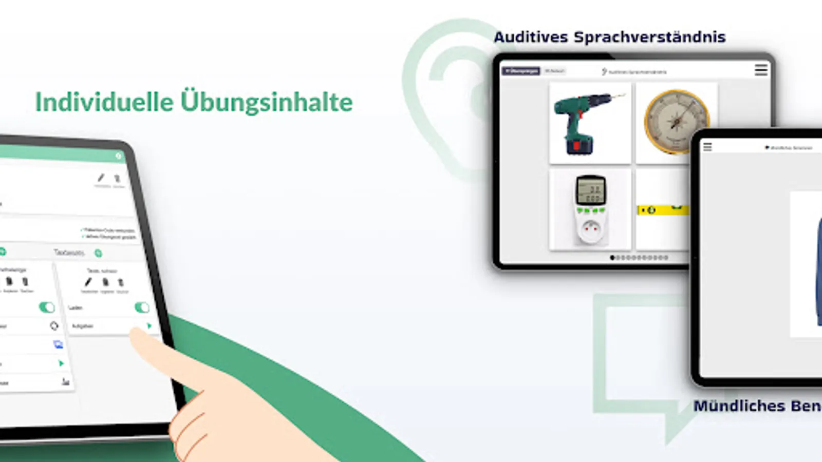 The app offers the opportunity to train the selected language units in flexibly adjustable exercises together with the patient in the therapy session. The areas of auditory language comprehension, reading comprehension, oral and written language production are trained. The "picture cards" function is also available, with which therapists can carry out free exercises with the exercise set.