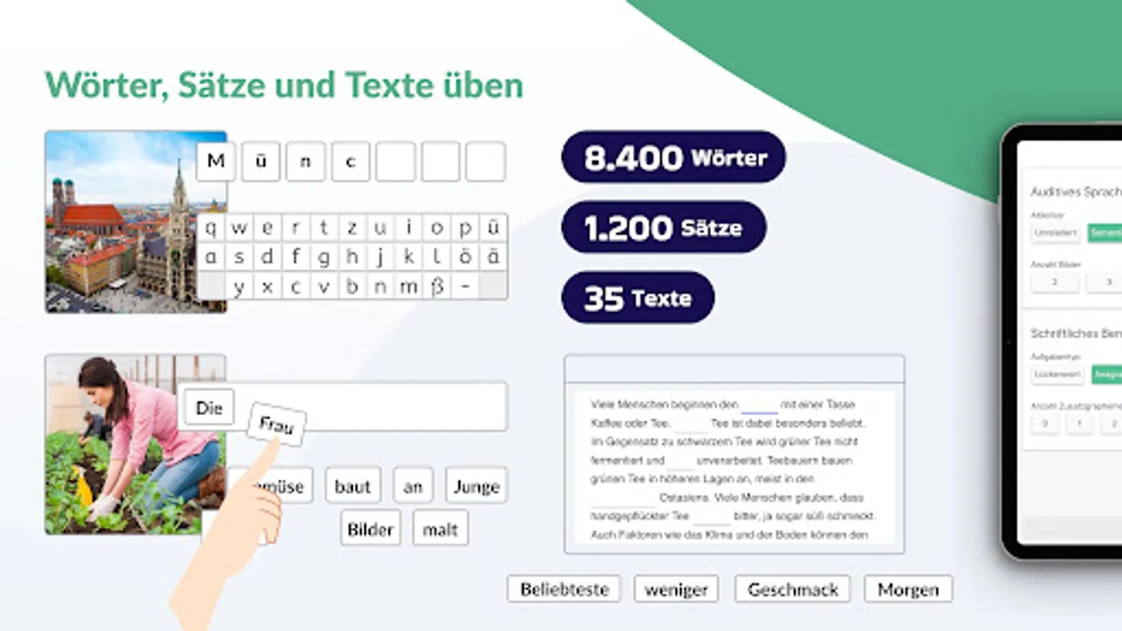 The difficulty of the individual exercises can be finely adjusted. For example, the number of distractor images can be specified and it can be determined whether these are semantically similar to the target word. In the "Writing" exercise type, you can choose between gap words, anagrams and free writing with the entire keyboard. Further setting options can be found in the app.
