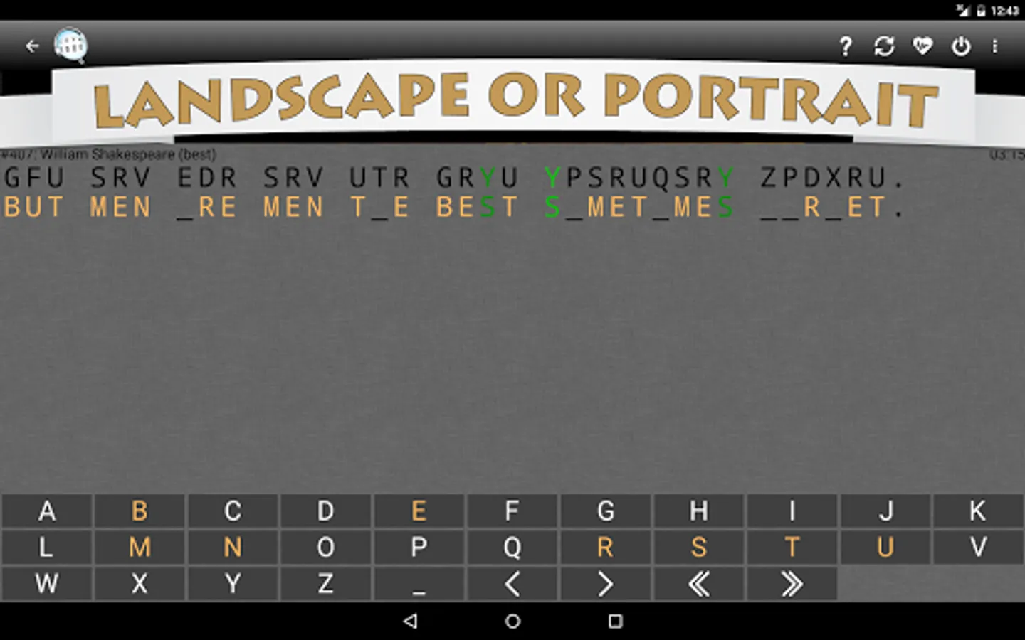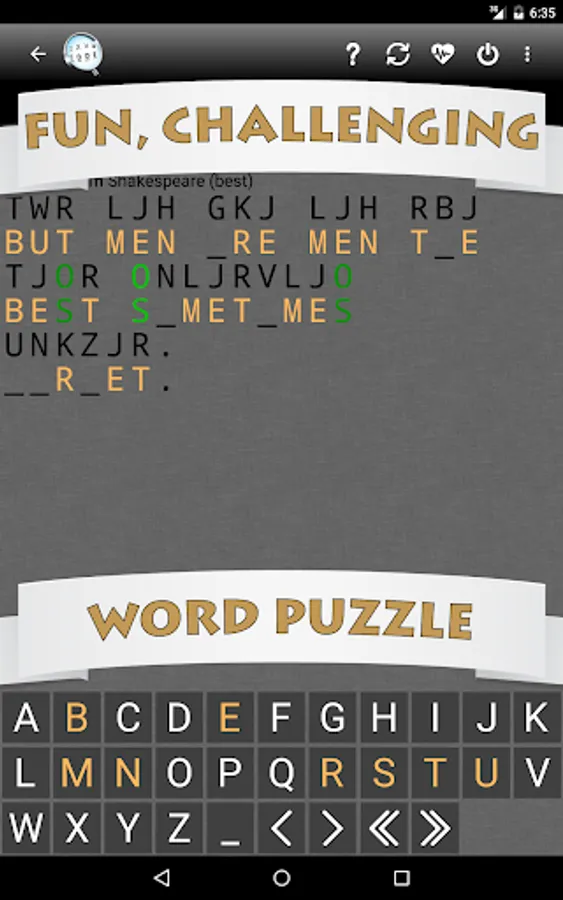 Play the role of a cryptographer tasked with the challenge of breaking an encrypted quote. To play, you must deduce the one-to-one letter substitution to decode the encrypted phrase by some famous (or infamous) author. While the object of the game is simple, figuring out the solution can often be difficult. Keep at it and perseverance will pay off.