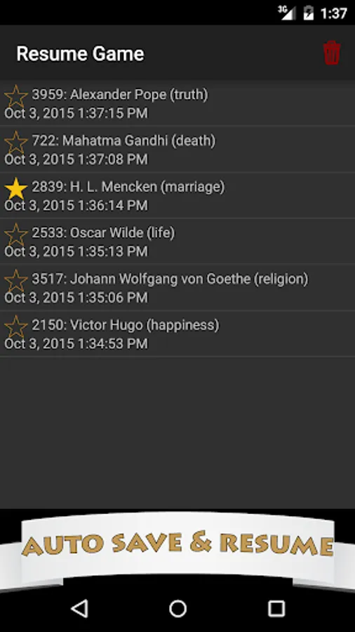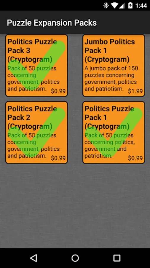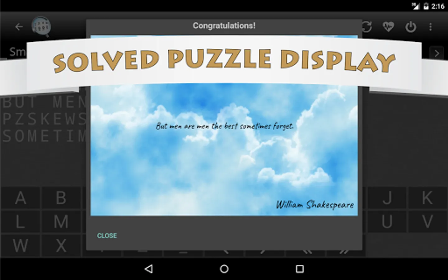 To start you off, we have included an abundance of quotes from a wide variety of historical and contemporary figures, and you can download additional puzzle packs from inside the game whenever you want more. Check back often, as the puzzle library is always undergoing growth. We offer standard-sized puzzle packs of 50 quotes and jumbo packs for the voracious player, which offers 150 puzzles all at once for a reduced cost. Collect them all!