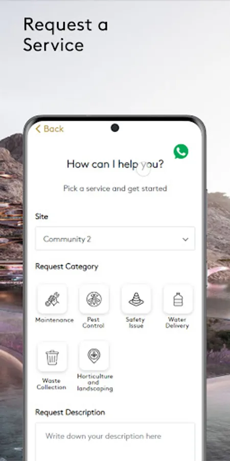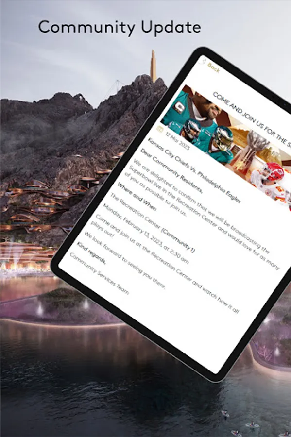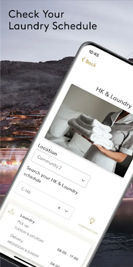 This application is providing a service for residents who live in NEOM Communities where users can check bus schedules, community updates, events, housekeeping and laundry schedule, and cinema schedule. Also, it will help all residents to report a maintenance issue or request a new service for example if one of the residents wants to request water for his or her unit or if a residents want to install new furniture in his unit.