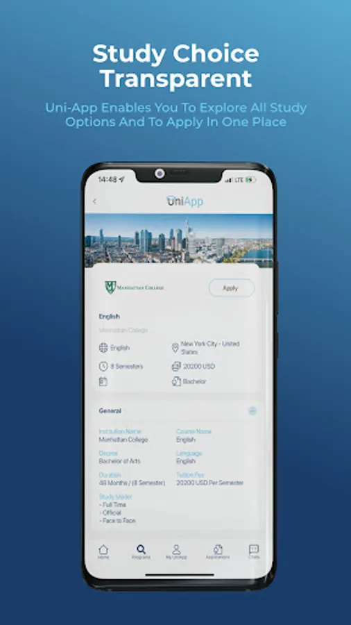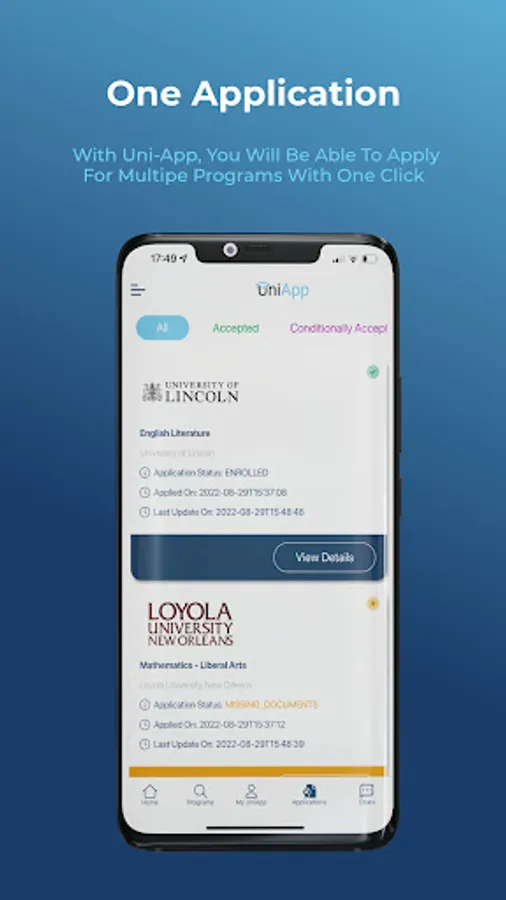 UniApp brings you top degrees from universities and colleges to study in Europe, the United Kingdom, the USA, Australia, Canada and many other countries. UniApp is easy to use; in short, as a student, all you need is to complete your UniApp profile; after completing it, you will be able to apply to multiple degrees in one single click.