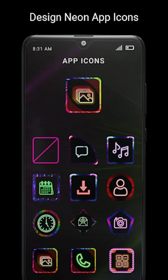Neon icon designer personalize your phone as it hides the particular app you want through setting self-generated neon icon. Replacing icon of an app with neon icon adds glowing neon effects through color filters and stickers.