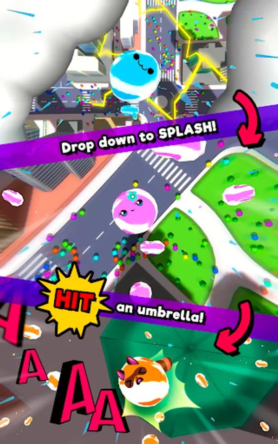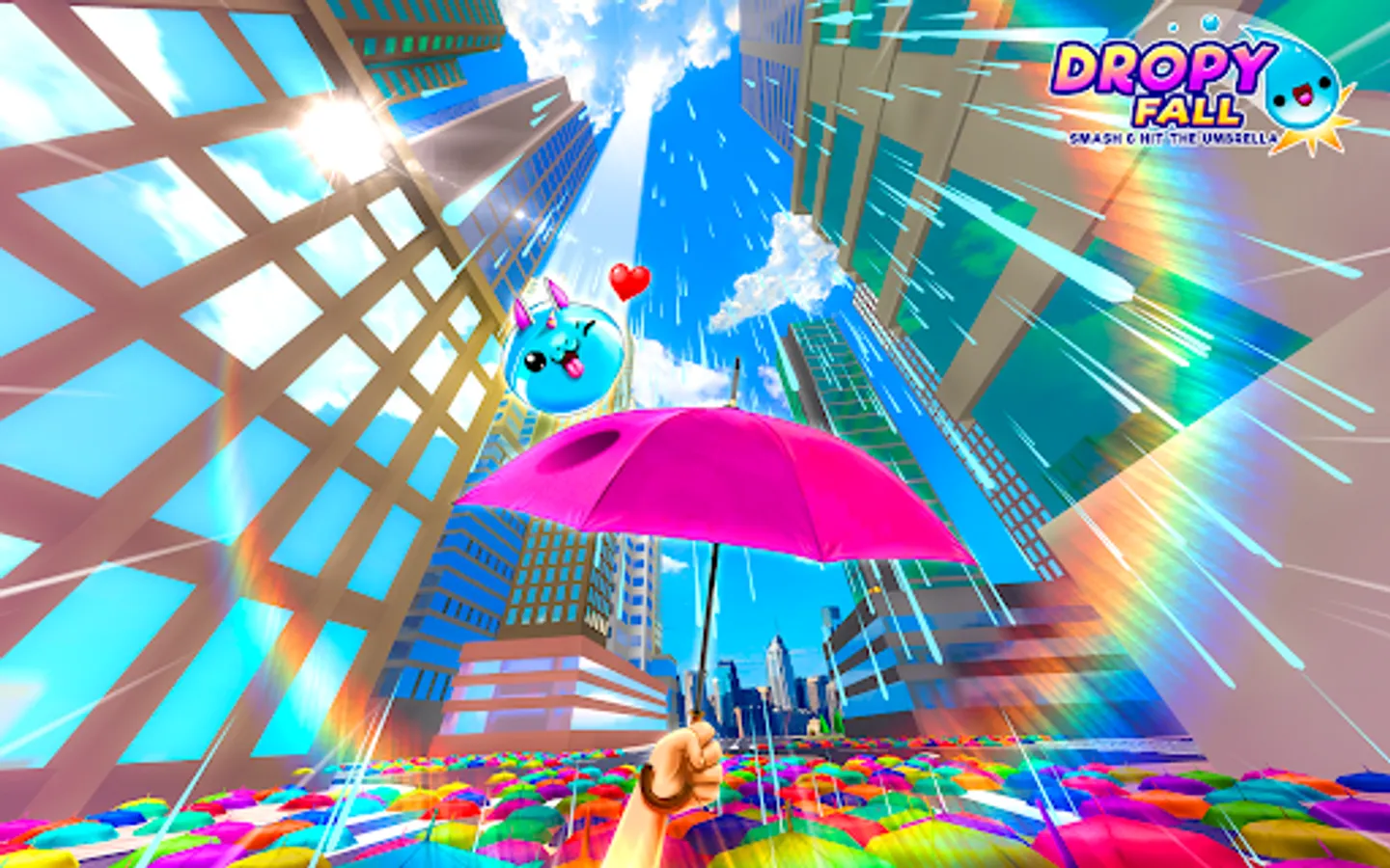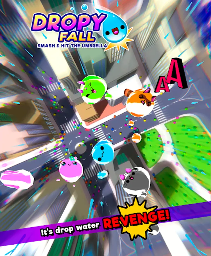 • Be the fastest kawaii drop guy in the city! Drop down dodging obstacles and splash that umbrella ☔