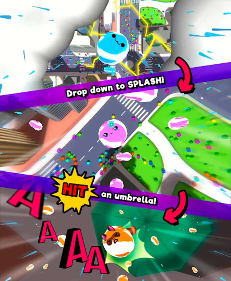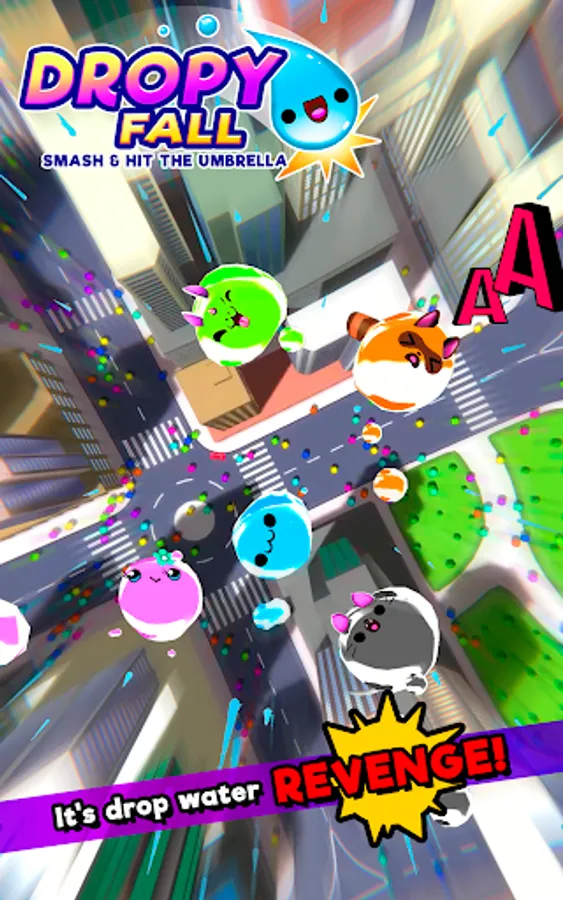 It's drop water revenge. Feel like a squishy falling ball! Drop down to splash, hit and smash umbrellas.