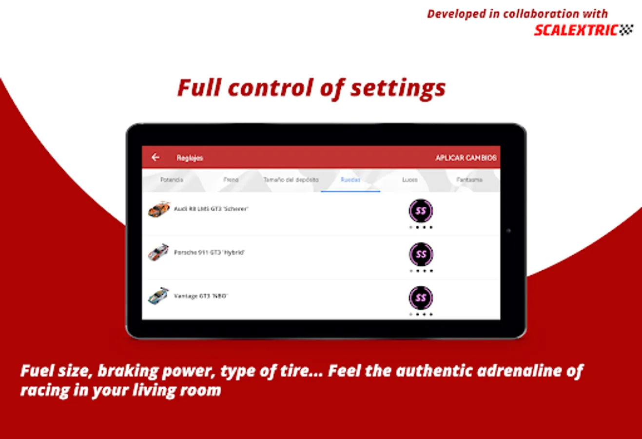 SXRacing is the only app that uses all of the Scalextric track commands, adding: AI cars to race against the machine, complete car and performance management.
