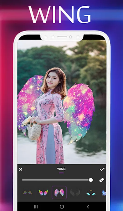 Among the best image editing techniques that we offer to the user through the photo editing application Neon Effects Photo Editor is that you can add very beautiful wings to yourself in order to change your external appearance and thus make yourself in the place of the bird through beautiful colored wings.