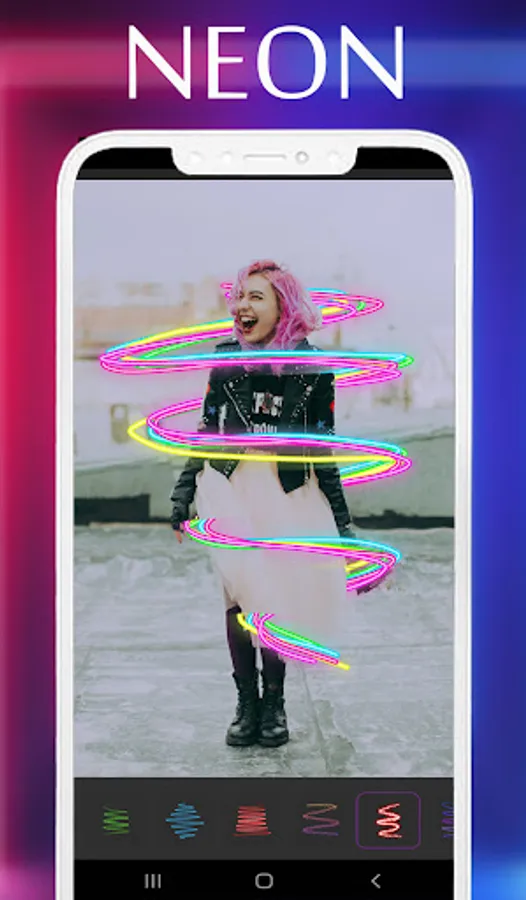 The Neon Effects Photo Editor application relies on automatic techniques to determine the body of the person inside the image in order to provide the best experience of adding neon effects to it, in addition to that it shows you a group consisting of more than 30 different neon that have a special aesthetic.
