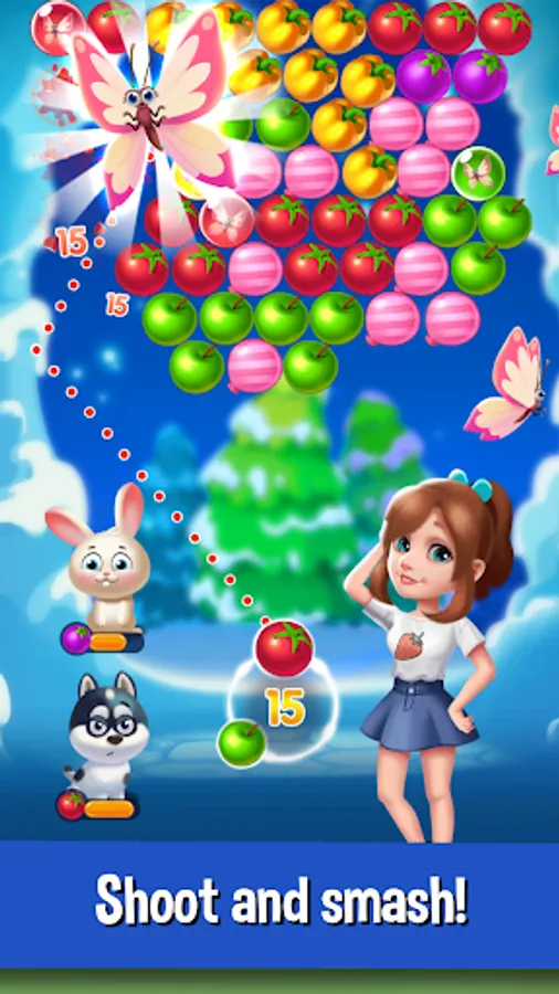 Help the bubble shooter girl to collect all kinds of fruits, free the trapped pets and battle the evil fox. Are you ready for the fruit blast adventure?