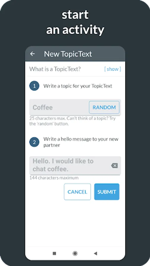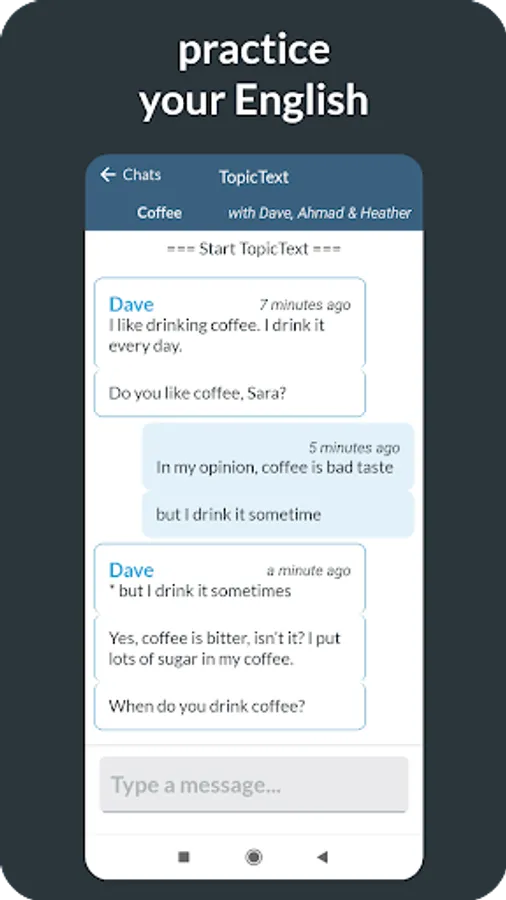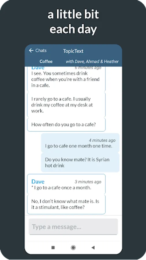Chatloop is a messaging app that connects you to a conversation partner in a chat room. Together, you'll do one of our communication practice activities. You'll only send a few messages each day, at a time convenient to you, so each activity lasts for about a week or so. When you finish one activity, we'll connect you to another partner for another activity. That way, you get a regular drip feed of authentic English practice.