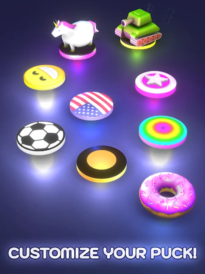 As well as the standard yellow puck, you can also unlock other fun balls - a unicorn, donut, tank, pink puck, USA USA puck, psychedelic multi-coloured puck, smiley emoji puck, soccer or football puck. You choose which one you want to play Buca with!