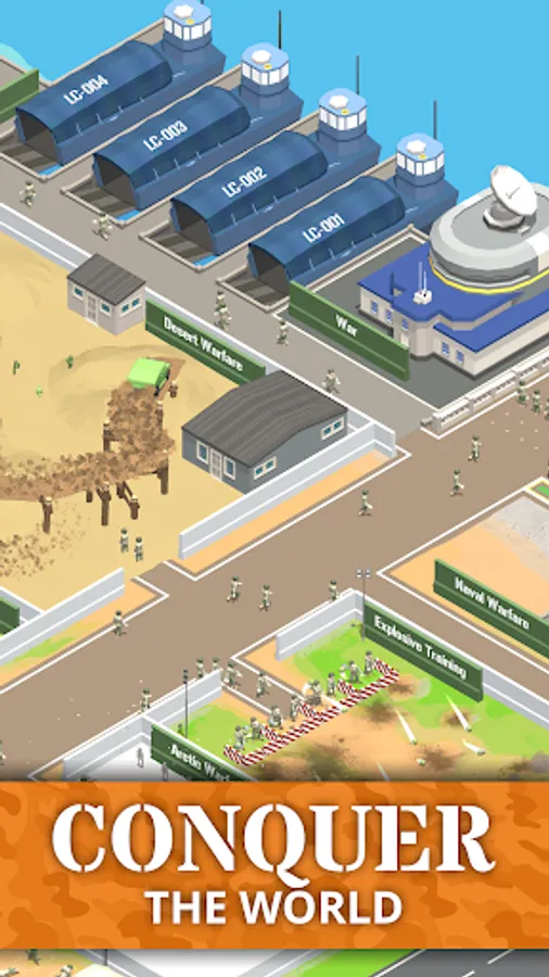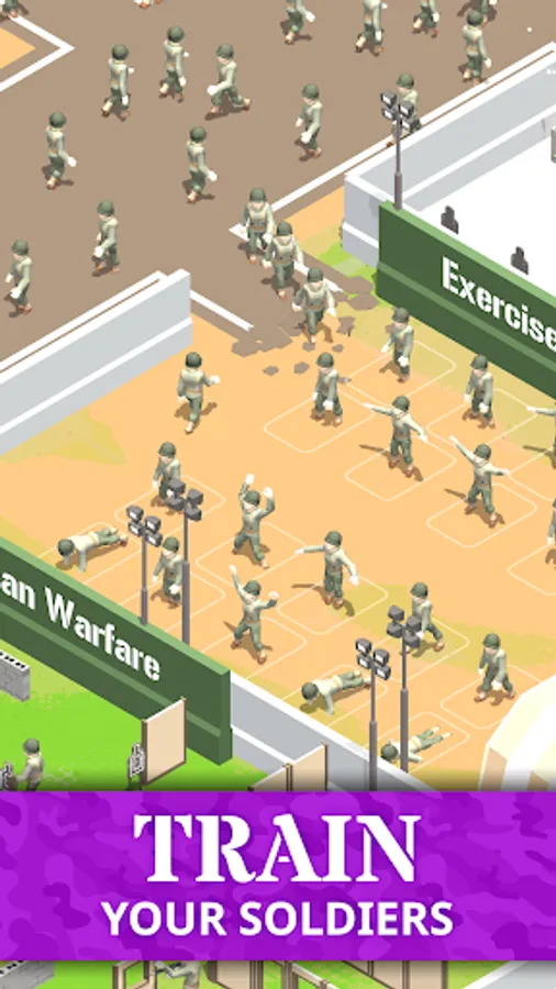 Become an army general and profit from your troops by managing your army base game like a tycoon. It’s a rollercoaster ride - no need to tap and tap or click and click - just invest, train your troops and win wars.