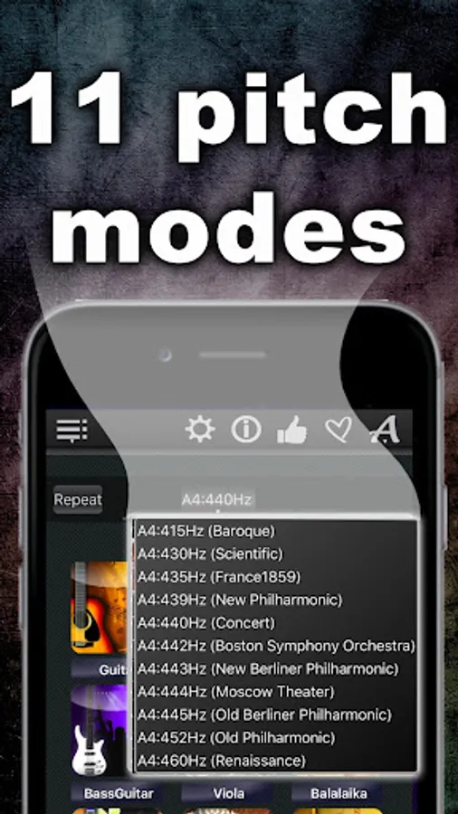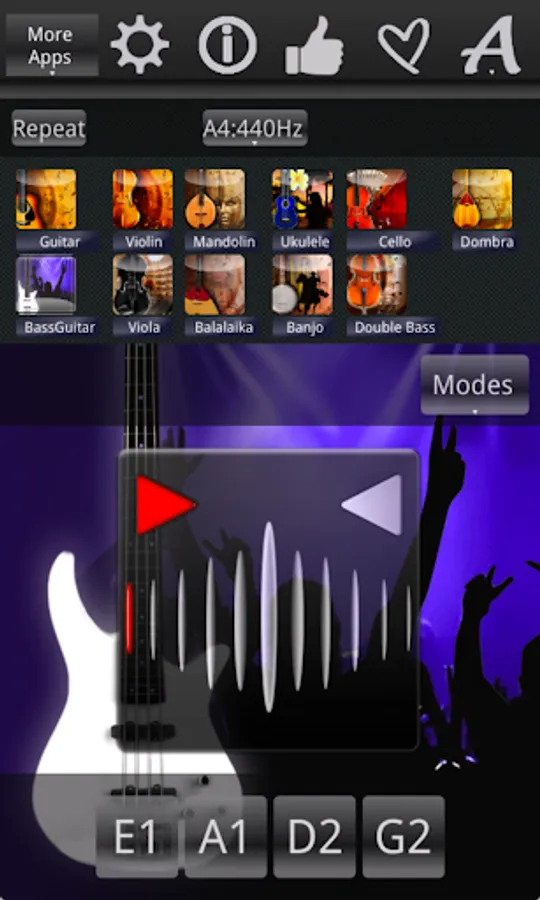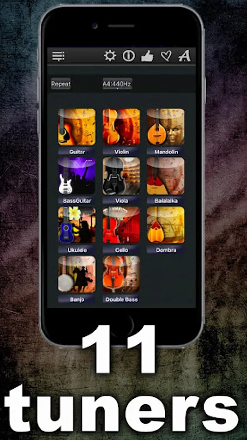 * 11 supported instruments: Guitar, Violin, Mandolin, Bass Guitar (4 and 5 String), Viola, Balalaika, Ukulele, Cello, Dombra, Banjo and Double Bass,