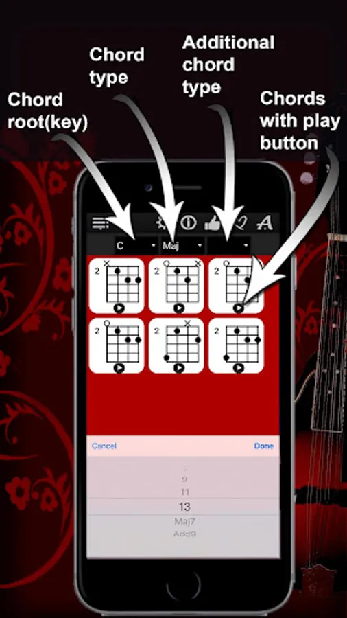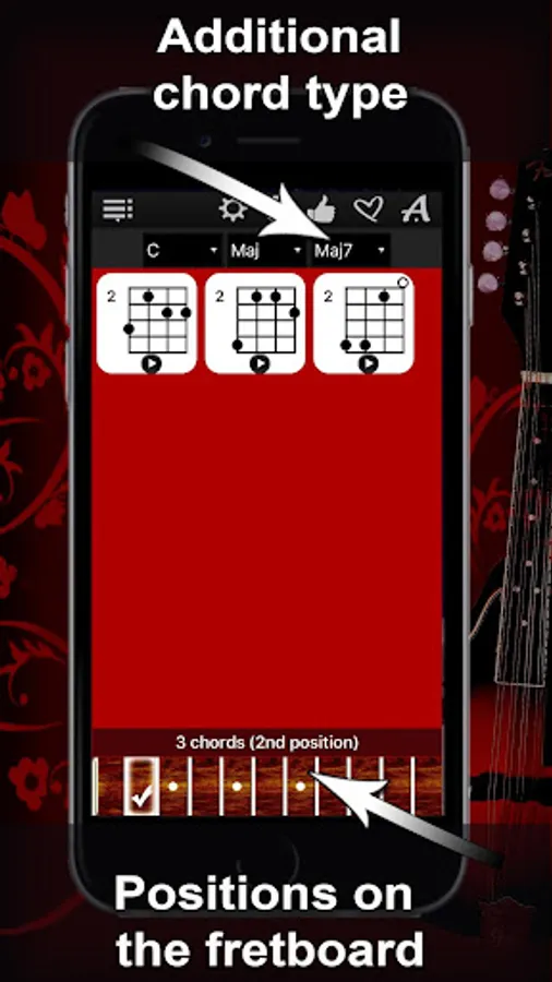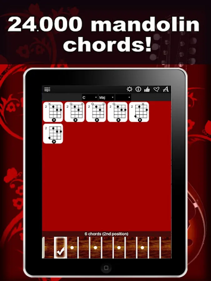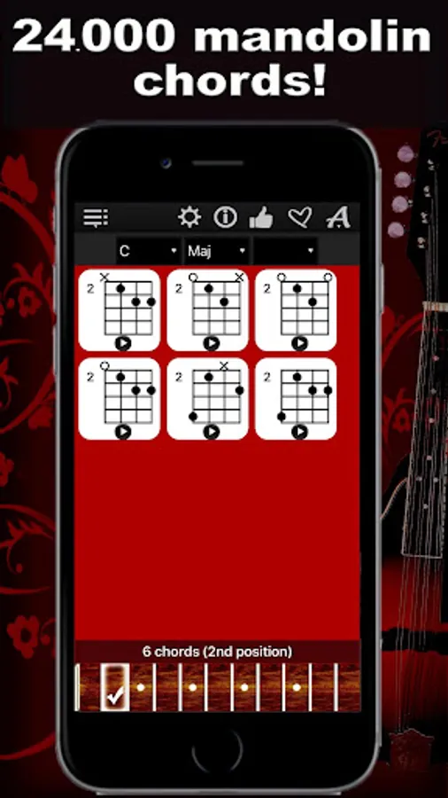 Thanks to a specially developed algorithm, the app will show you chord diagrams with all possible options in all 11 positions of the fretboard. Simply select a chord root on the left, chord type in the middle, the chord type addition on the right, and explore the chords with “Mandolin Chords Compass”!