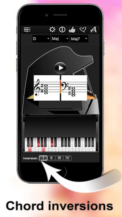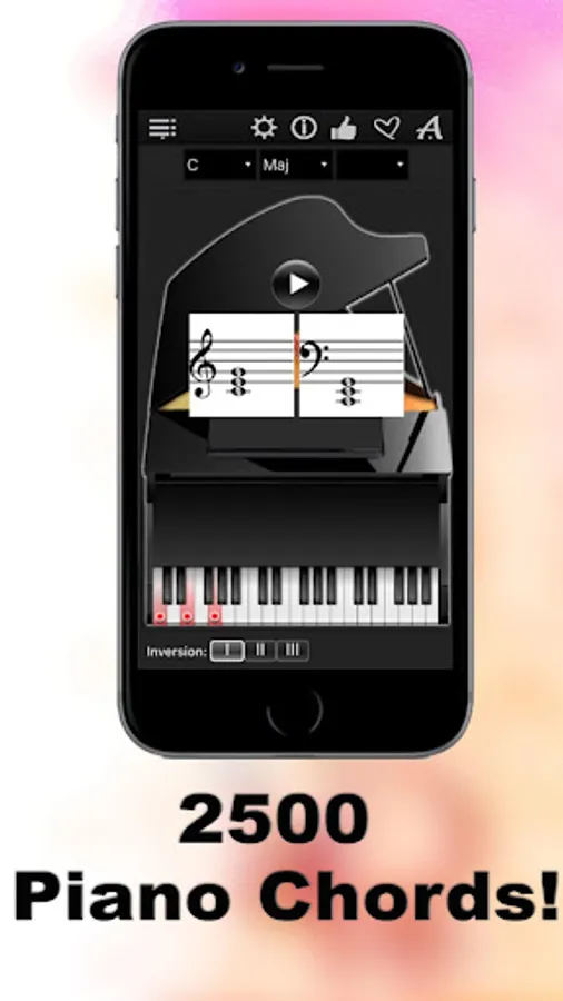 Thanks to a specially developed algorithm, the app can show you more than 2500 chords. Simply select a chord root on the left, chord type in the middle, the chord type addition on the right, and explore the chords with “Piano Chords Compass”!