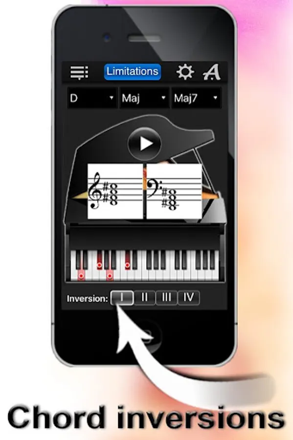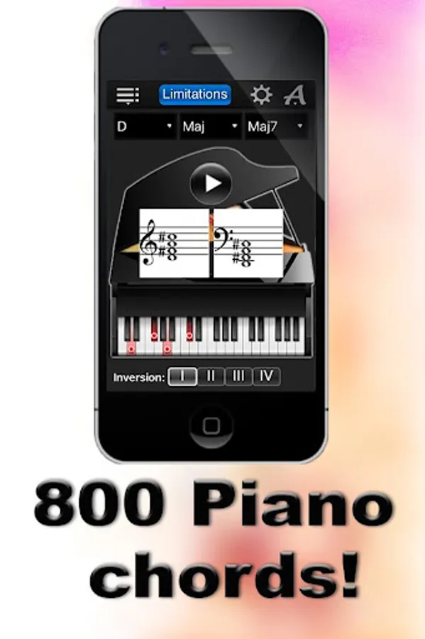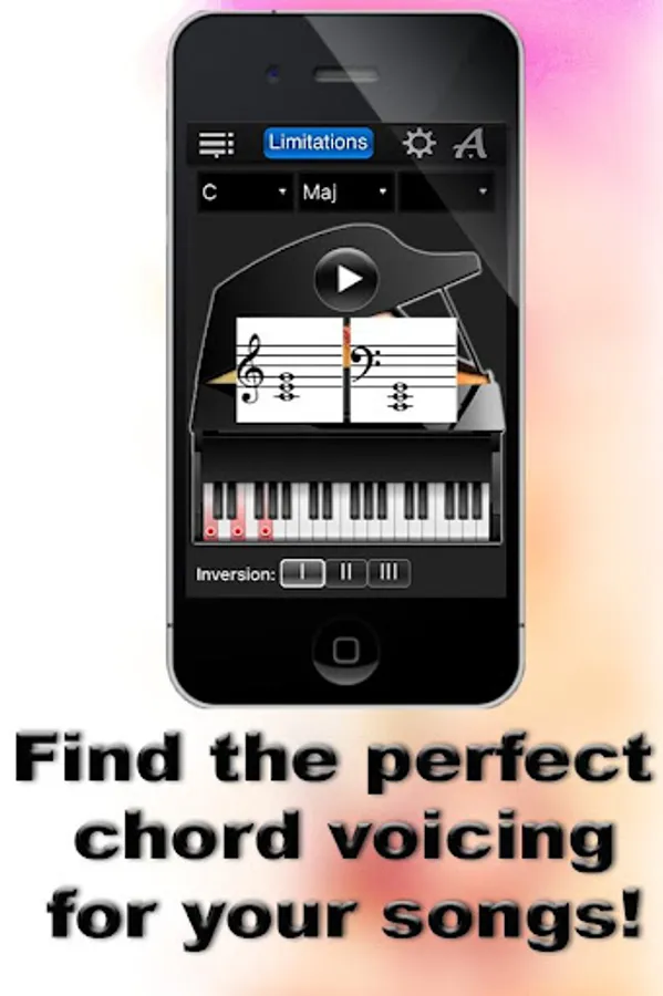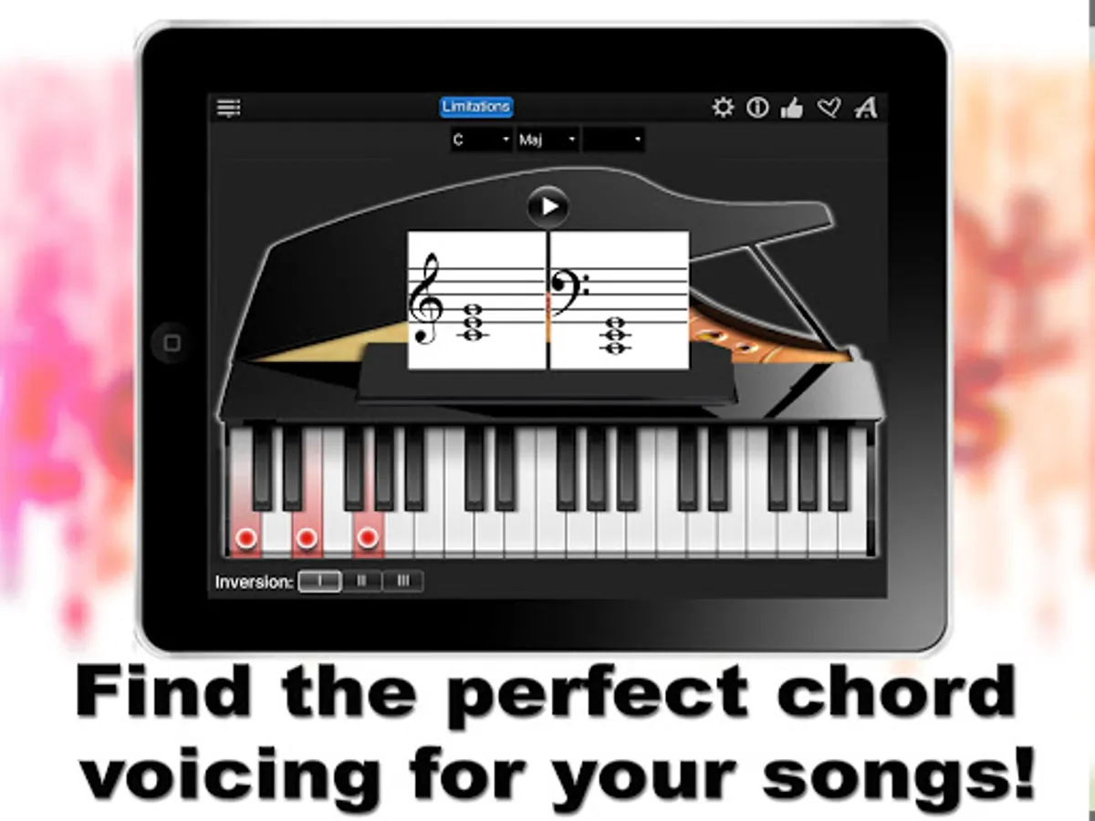 Thanks to a specially developed algorithm, the app can show you more than 800 chords. Simply select a chord root on the left, chord type in the middle, the chord type addition on the right, and explore the chords with “Piano Chords Compass Lite”!