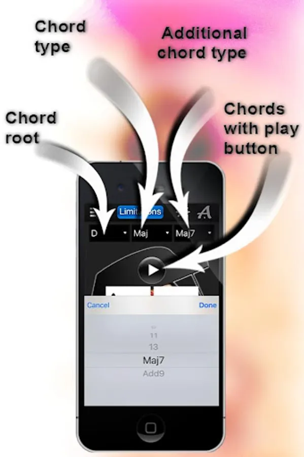 - The displayed chord type notation and chord set fully compatible with the GarageBand smart instruments;