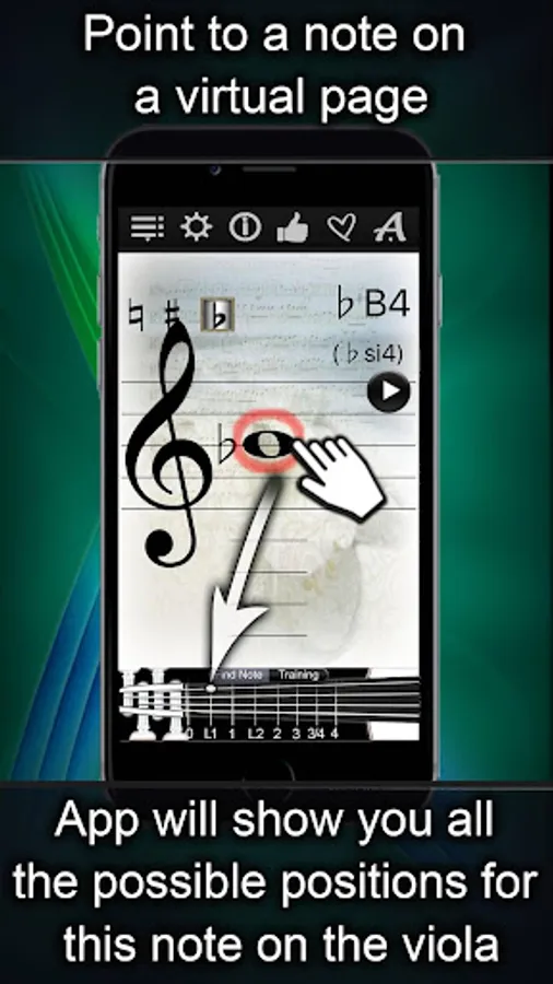 When you point to a note on a virtual page, ViolaNotesFinder will show you where this note is on a Viola and the other way around, if you click Viola, you will see the corresponding note and hear the sound it makes.
