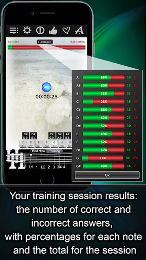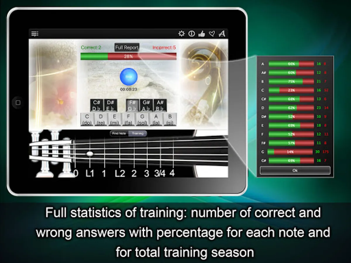 The “Notes Trainer” asks for the notes, showing you the places, and offers the full statistics to show where you are making mistakes, so you can measure progress in sight reading and see when you’ve exceeded your personal best.