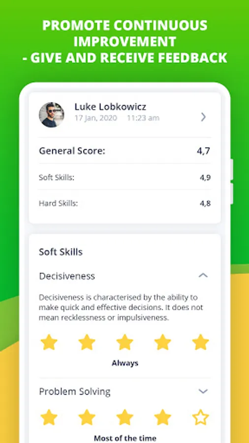 Search for any colleague in the organization, from interns to the CEO, and give or request feedback. You can evaluate their soft skills and hard skills, and provide comments on their performance with CONTINUE, STOP, START framework so your feedback is really understood and actionable.