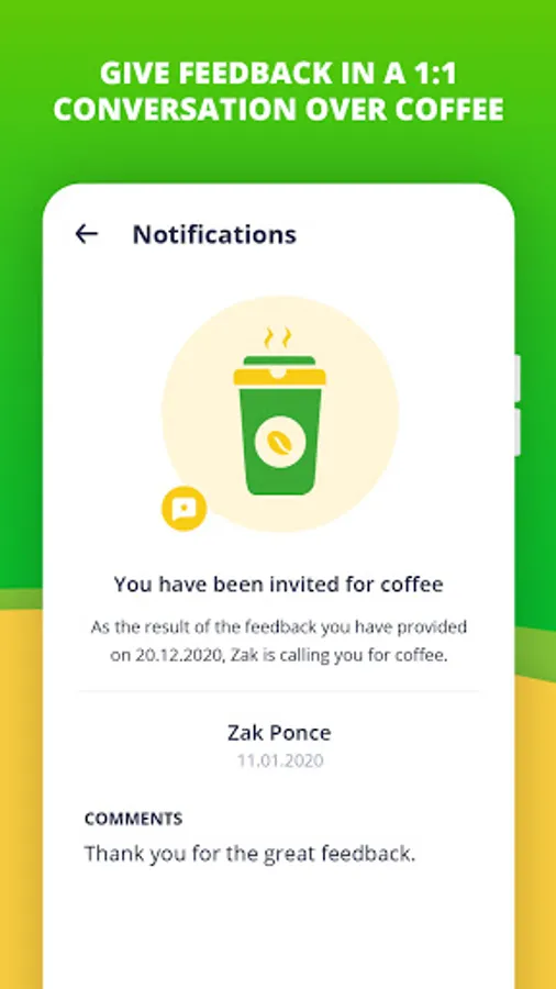 The best feedback is provided in a conversation. With WeGrow, you can "invite coffee" to a colleague so you can talk about what are their strengths and areas to improve. Inviting for coffee is an excuse to discuss the feedback in more detail, get examples of what went well, what to improve, and make sure your fully understand the context of their feedback.