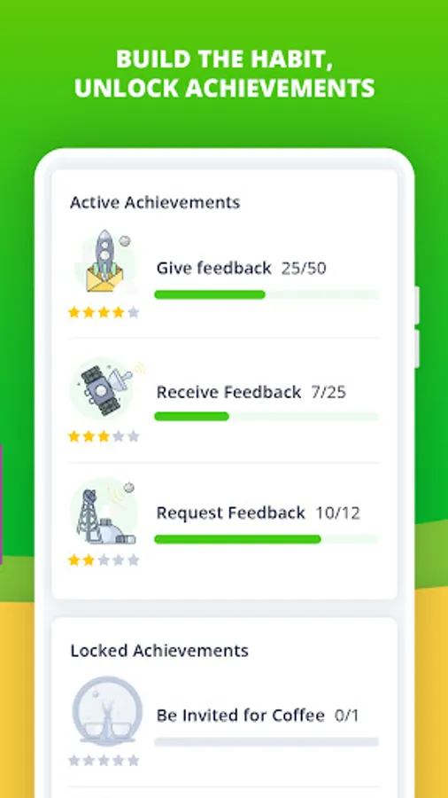 With continuous positive reinforcement, it's easier for us to build habits. WeGrow provides badges for giving feedback, requesting feedback, receiving feedback, inviting for coffee, etc. It's a great way to get motivated and build a culture of feedback in the organization.